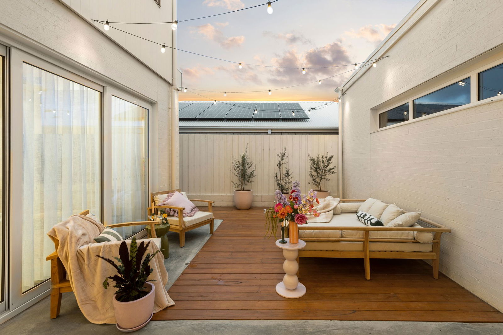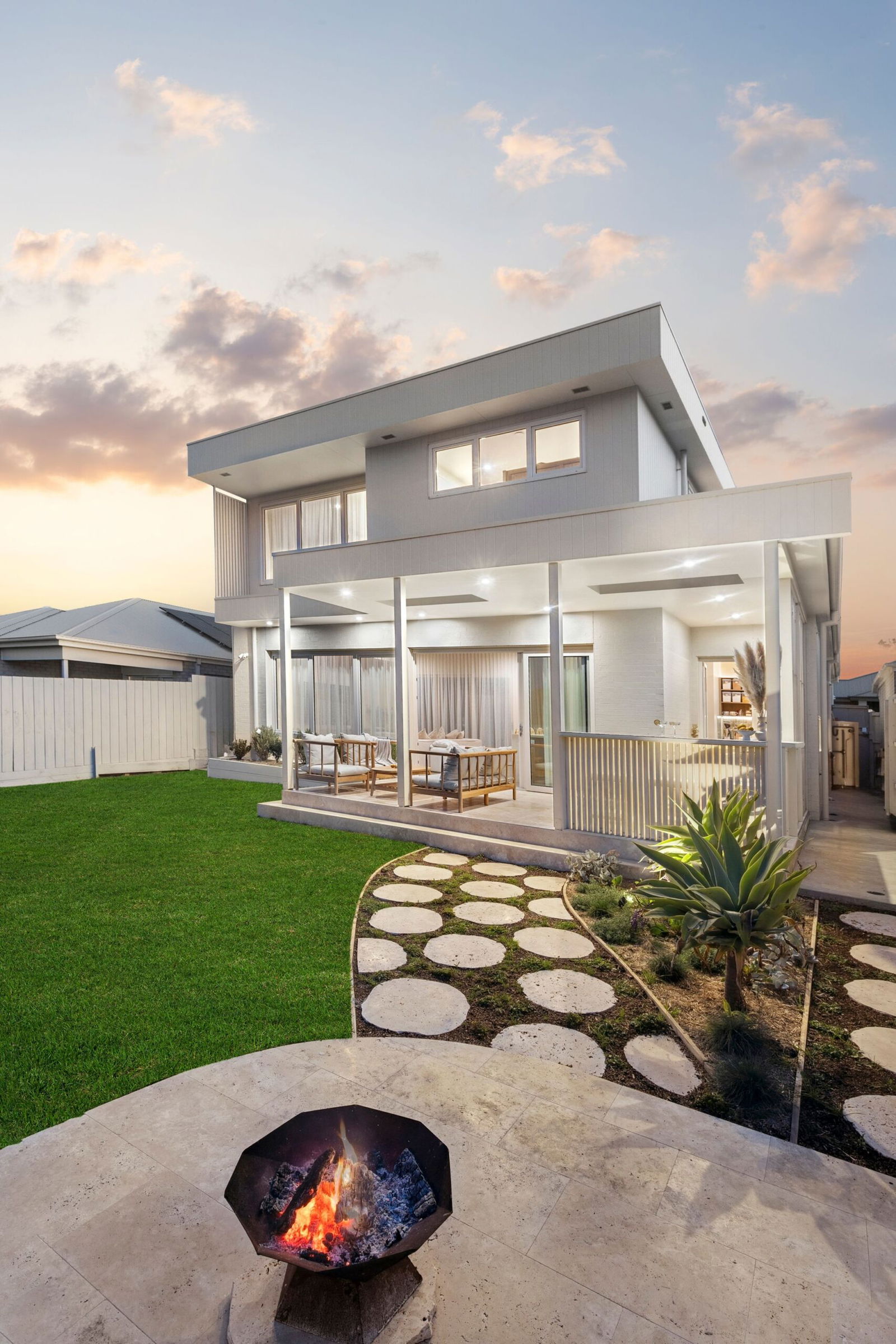 Outside: Architecturally-designed landscapes embrace a multi-material facade, stretching the entire 448sqm (approx.) allotment to include a covered alfresco with travertine ‘sand’ tiles, built-in bench, and skylights. Accompanied by a dedicated fire pit with custom seating, a sun-drenched decking, grassy play space for children, and a double garage with interior access.