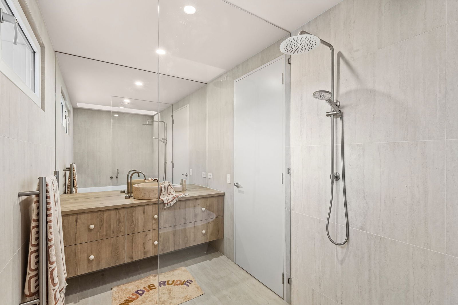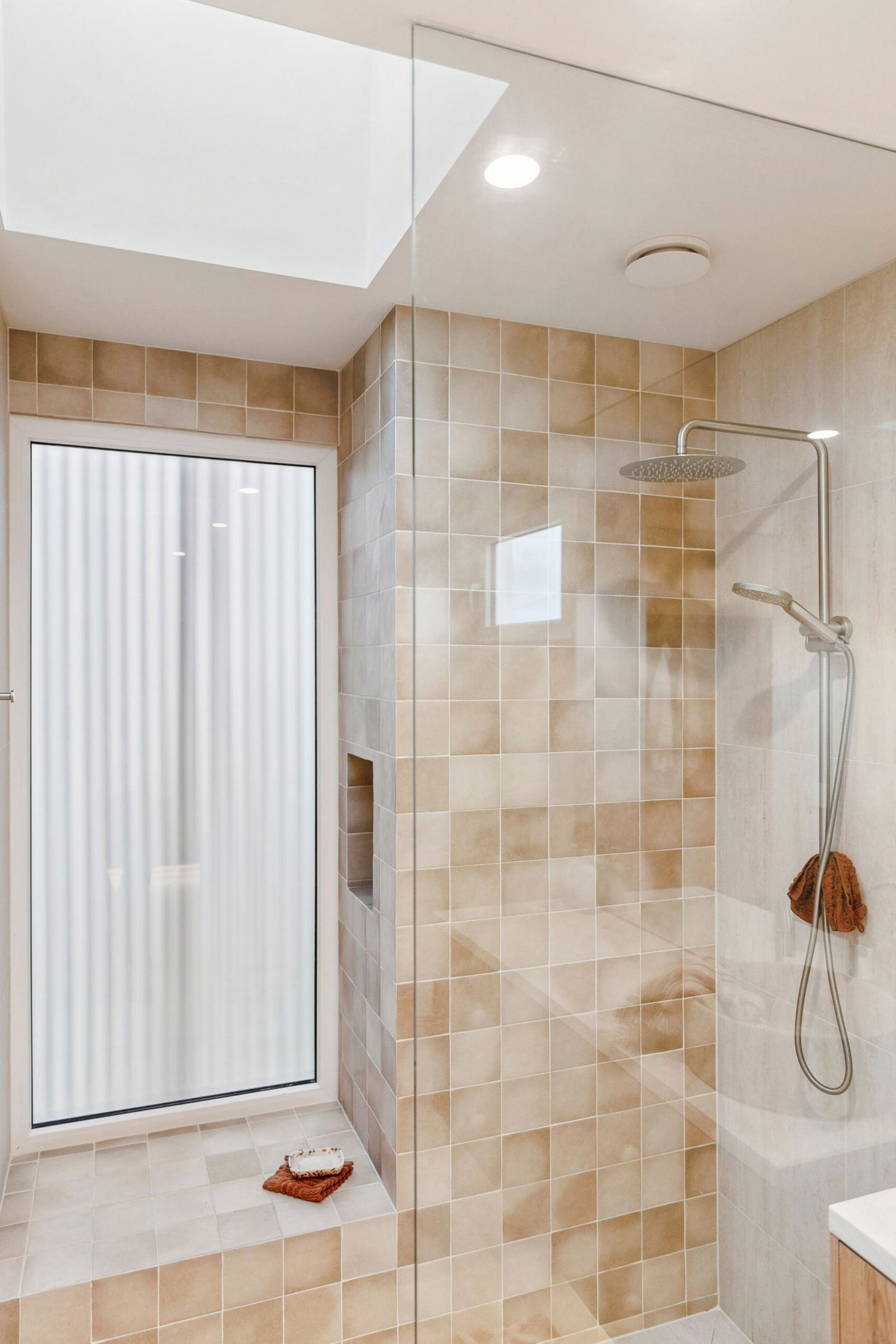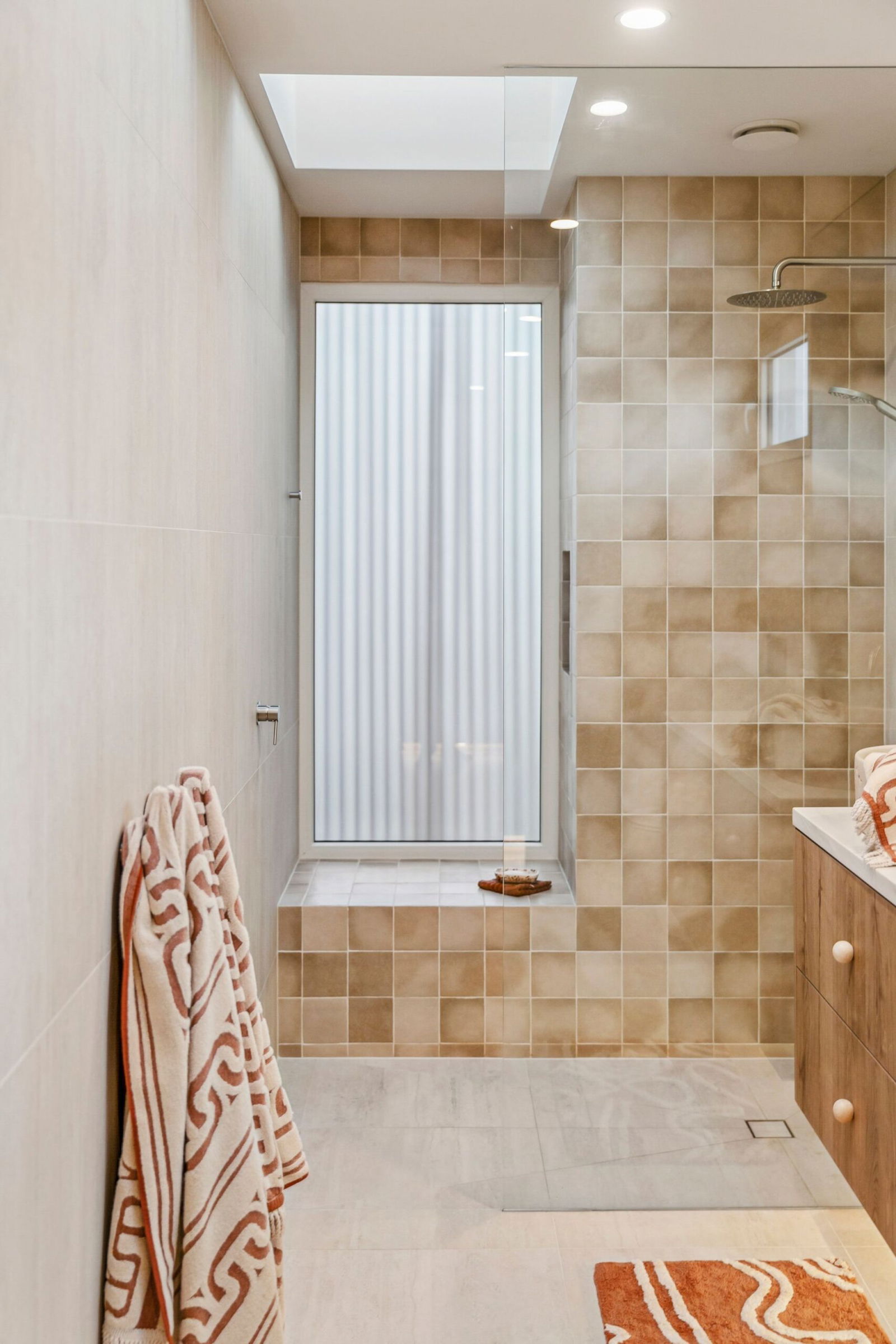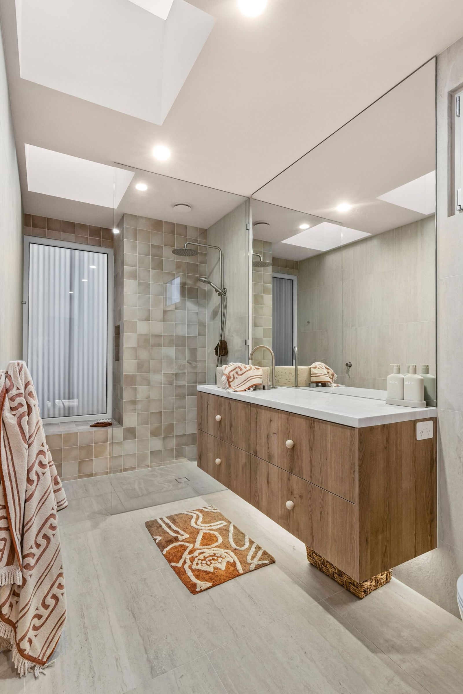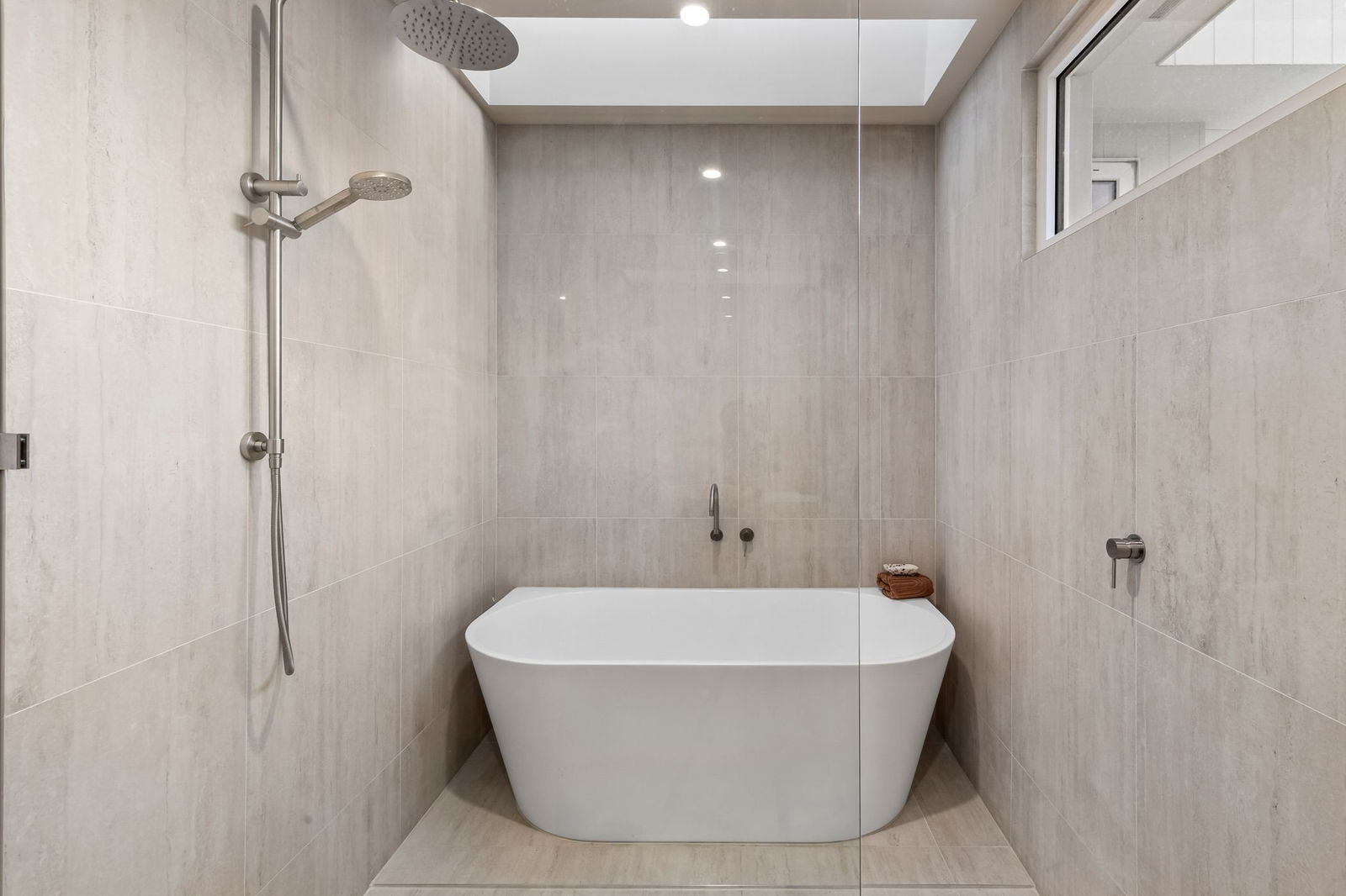 Main Bathroom: Full-height tiling, walk-in wet room with skylight over freestanding tub and shower with dual heads. Heated towel rail, vanity with underbench storage, and separate toilet.