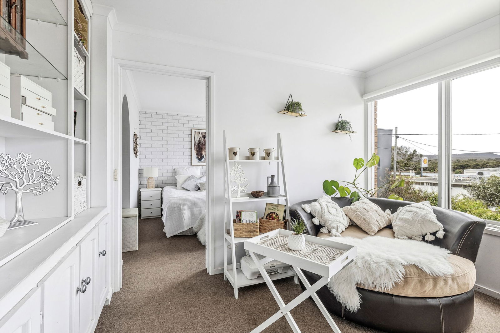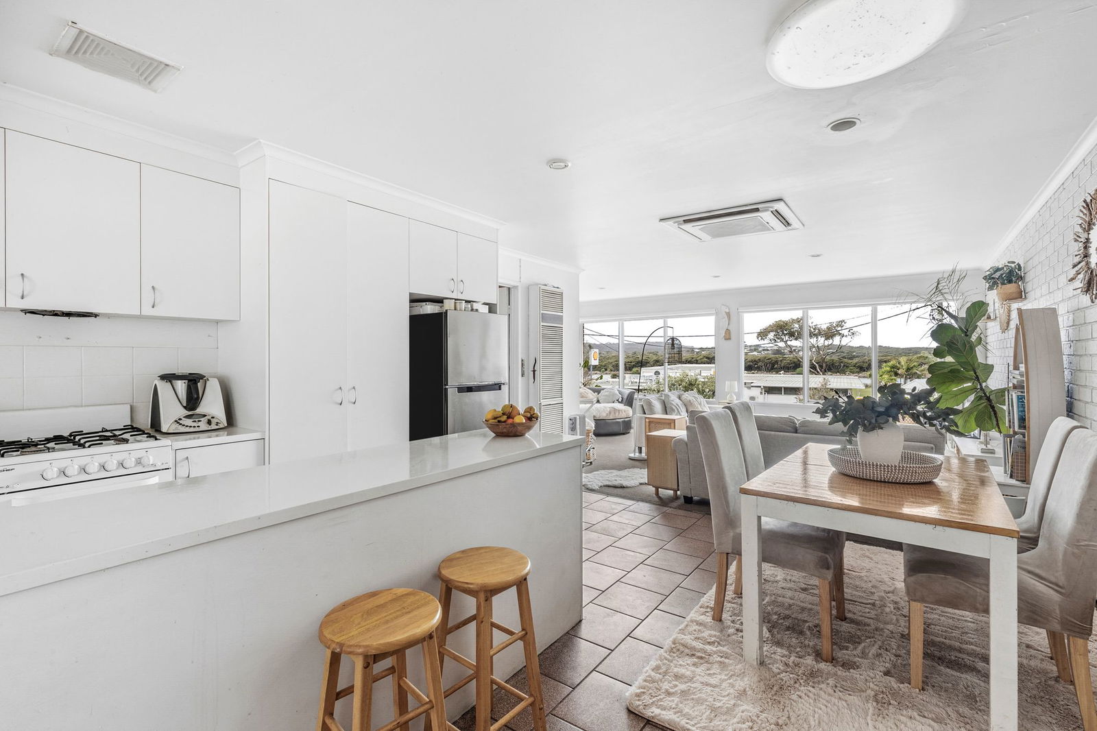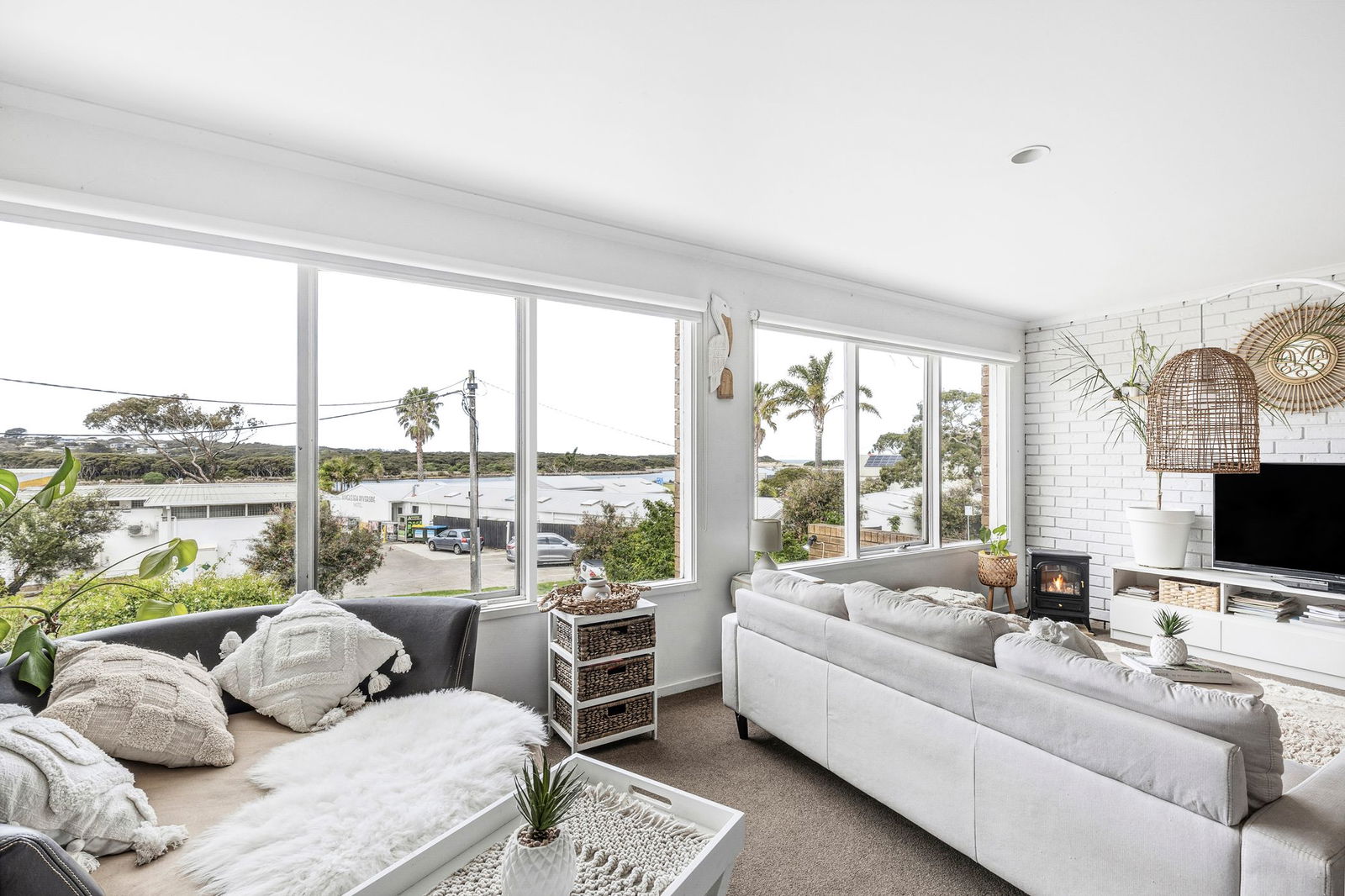 Living/Dining – Open plan living and dining area with views over the mouth of the Anglesea River through large picture windows through to the breaking waves of Anglesea Main Beach. Feature white-painted brick walls complement neutral carpet.
