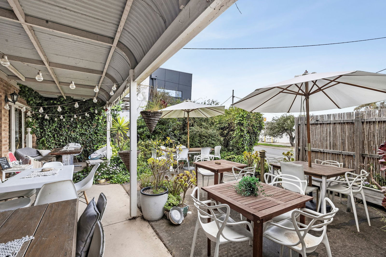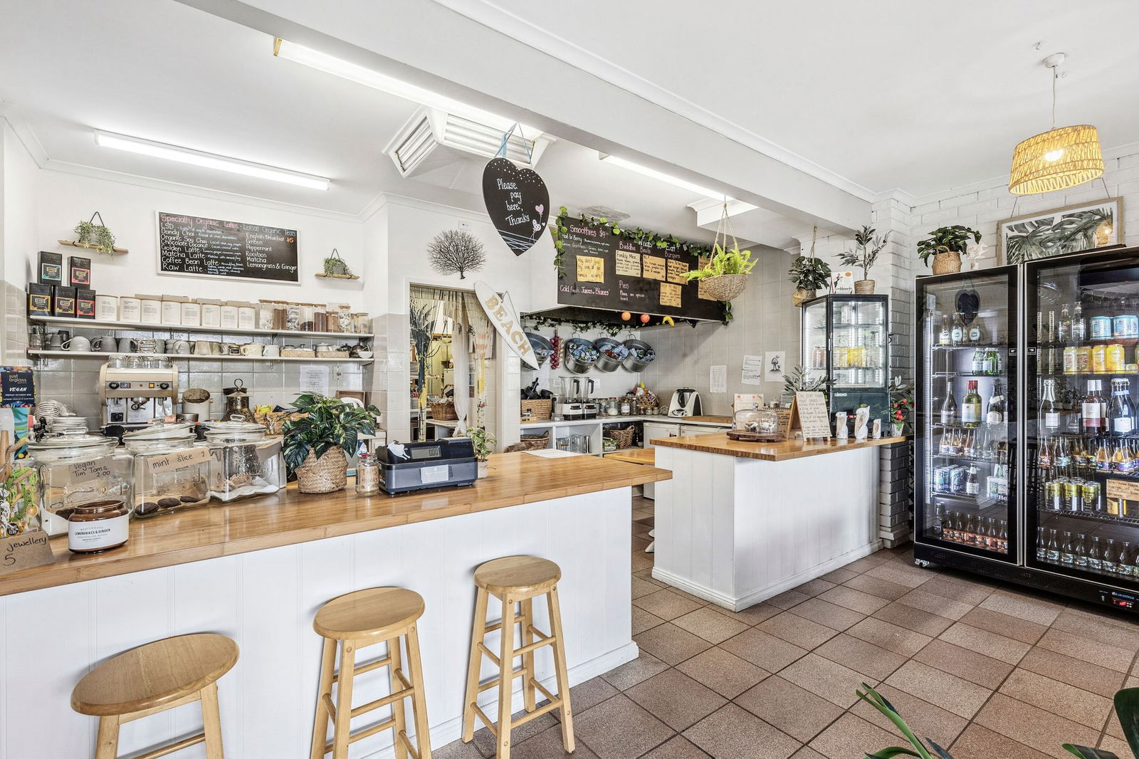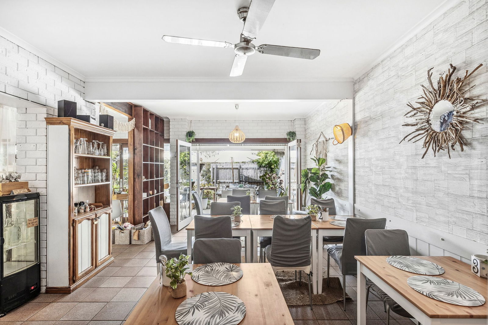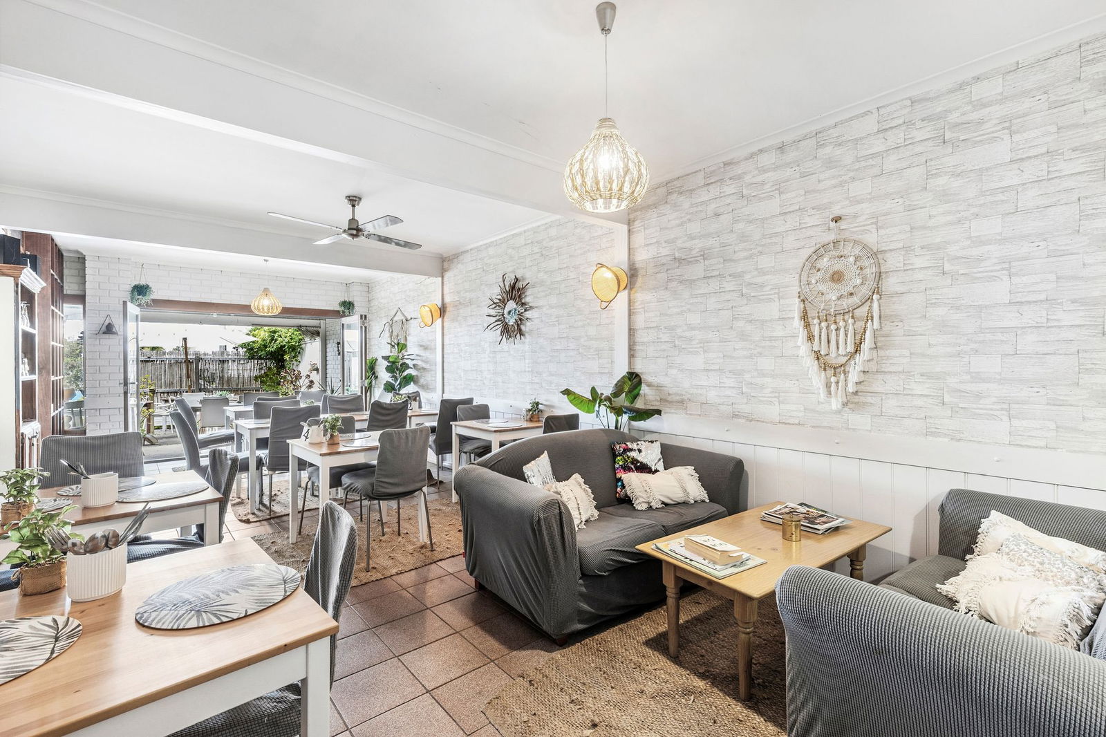 Restaurant: Spacious restaurant/café with indoor and outdoor seating for approximately 50 patrons. Features commercial-grade cooking facilities, multiple food prep areas, cool room, dry goods storage and customer amenities. A separate room off the main dining area suits private functions or alternative uses such as massage or beauty therapy. Front outdoor terrace provides additional seating.