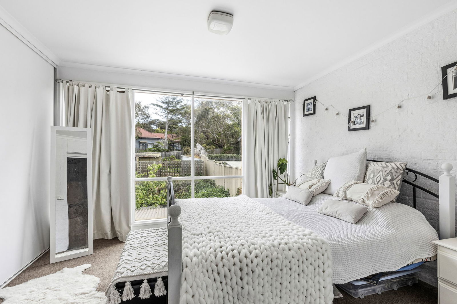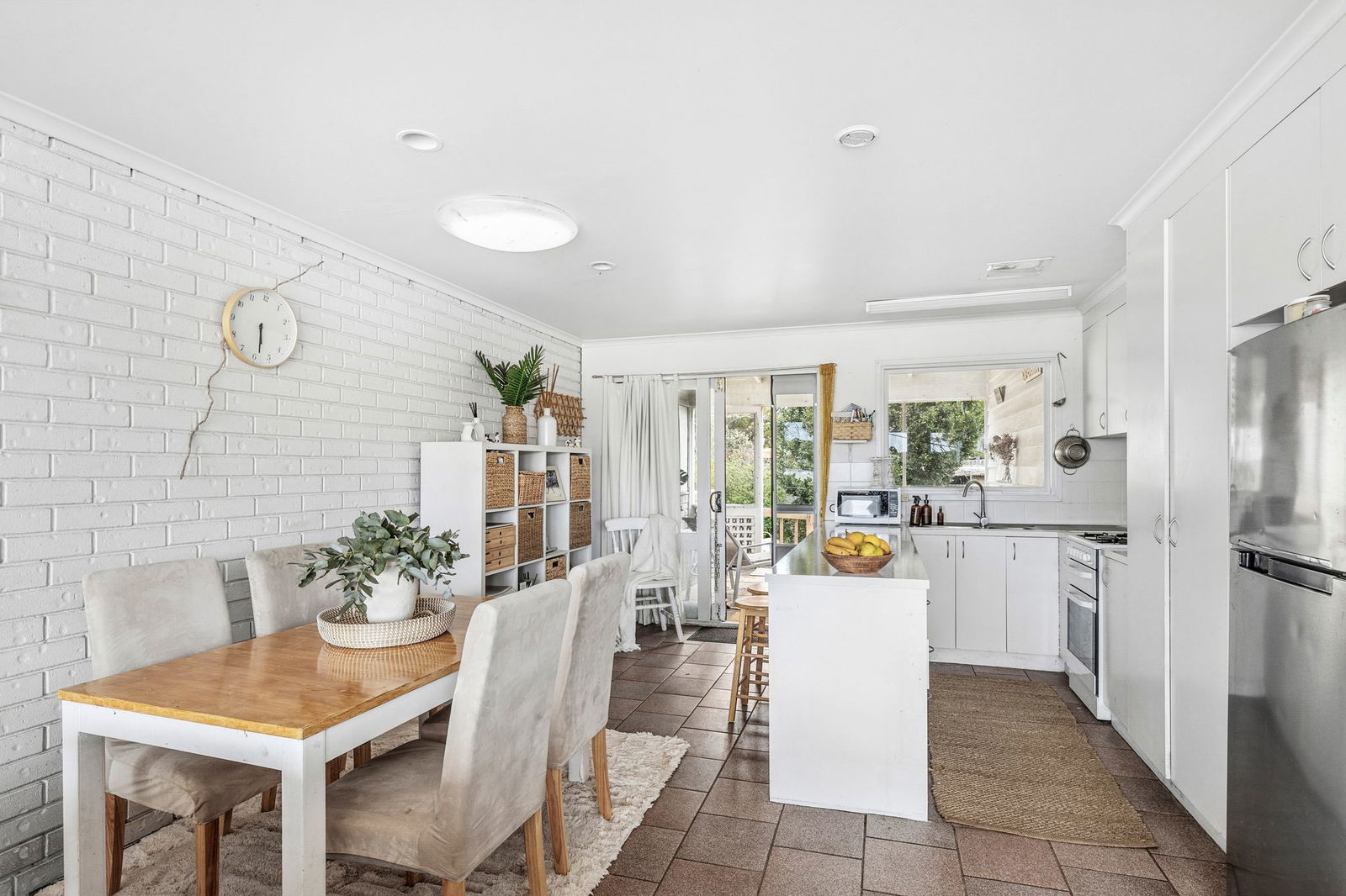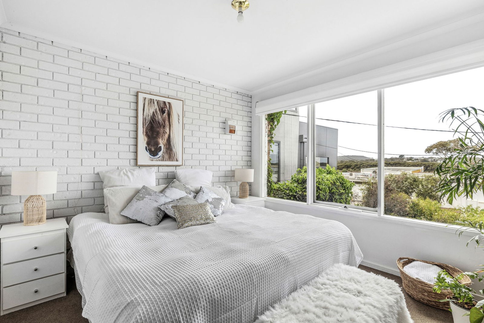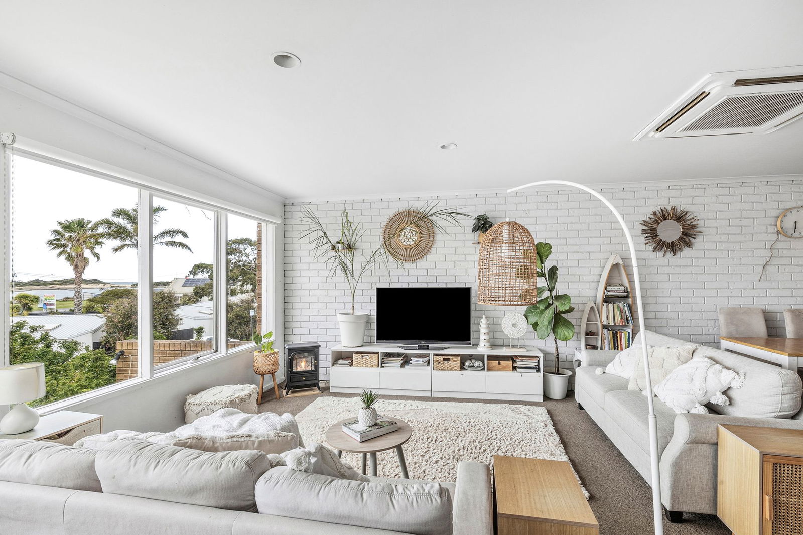 Living & Dining: Open-plan living and dining with large picture windows capturing views across the Anglesea River to the breaking waves of Anglesea Main Beach. White-painted brick feature walls and neutral carpet complete the space.