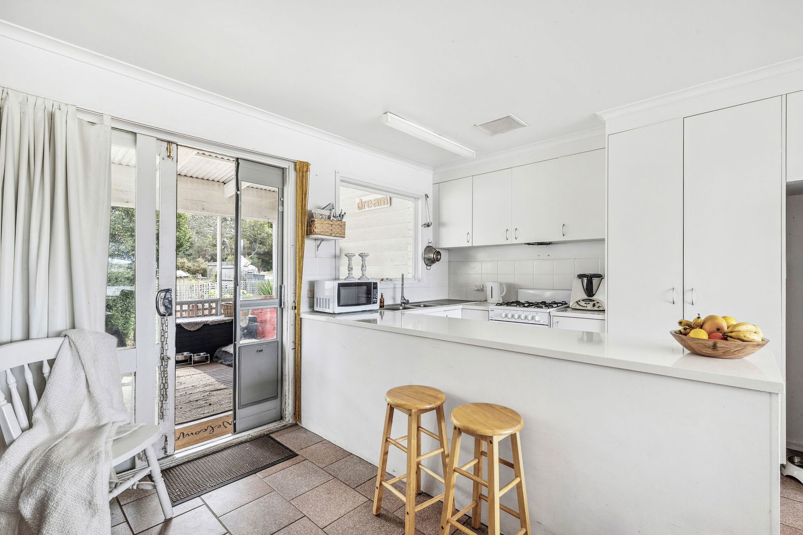 Kitchen (Upstairs): Compact, functional kitchen with ample storage, white-painted timber benchtops and double stainless-steel sink, overlooking the covered timber deck.