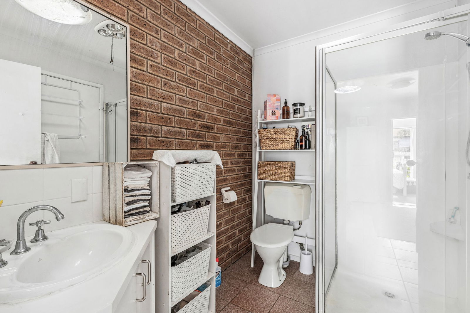 Bathroom: Dual-entry bathroom accessed from the main bedroom walk-in robe and third bedroom/study, featuring a corner glass-framed shower, corner vanity and toilet.