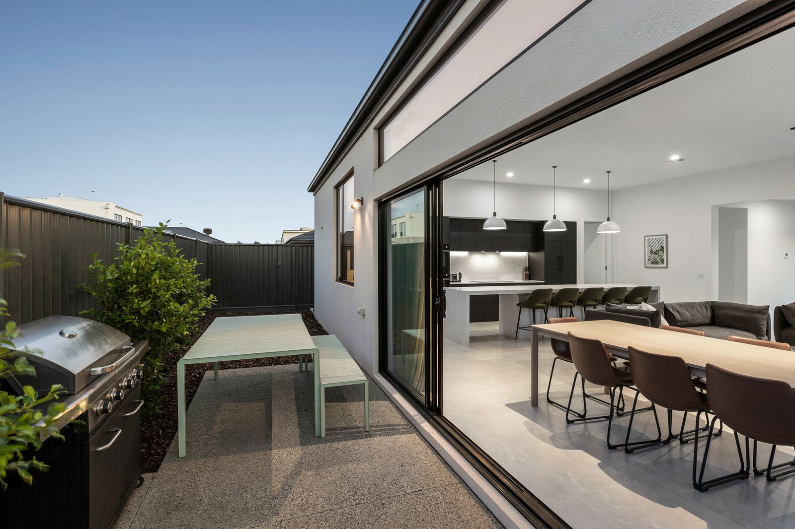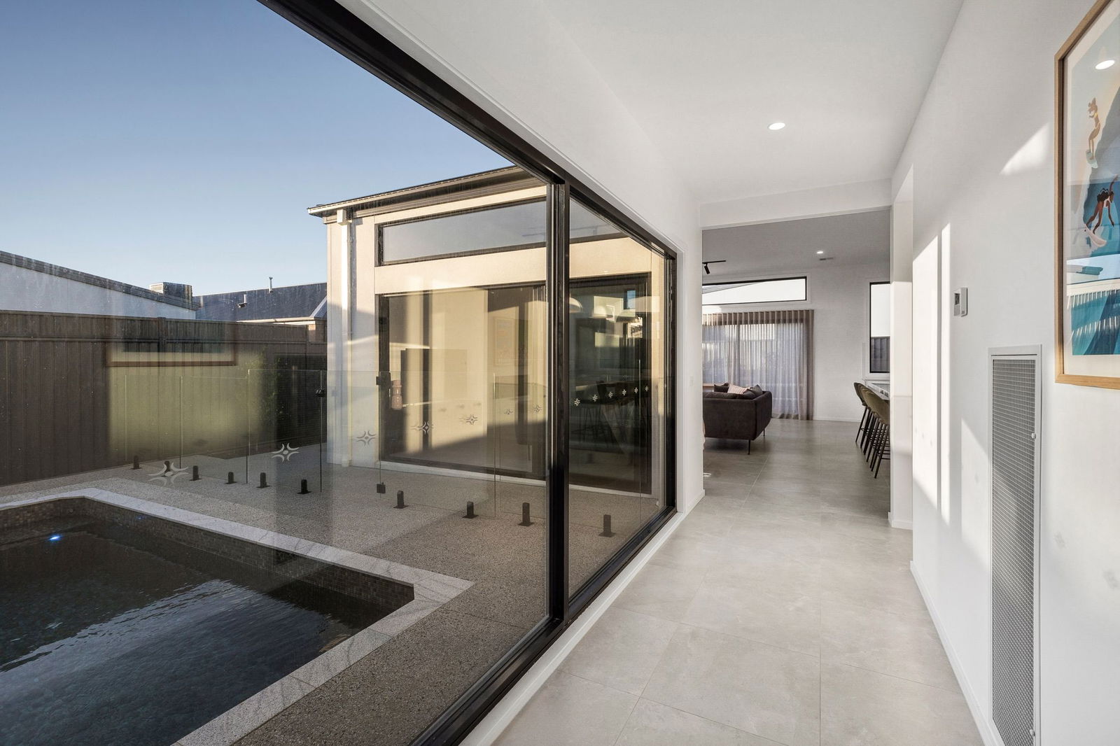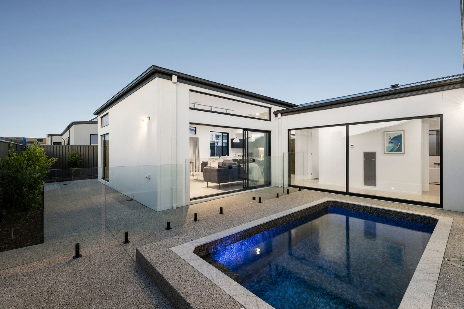 Outdoors – Fully landscaped front garden and a private back yard. In-ground concrete plunge heated pool – fully automated and controlled through an app with mosaic tiling, frameless glass balustrading and high-end filtration system. Low maintenance synthetic turf, gardens and pebblecrete pathways. Oversized double lock up garage. Solar panles