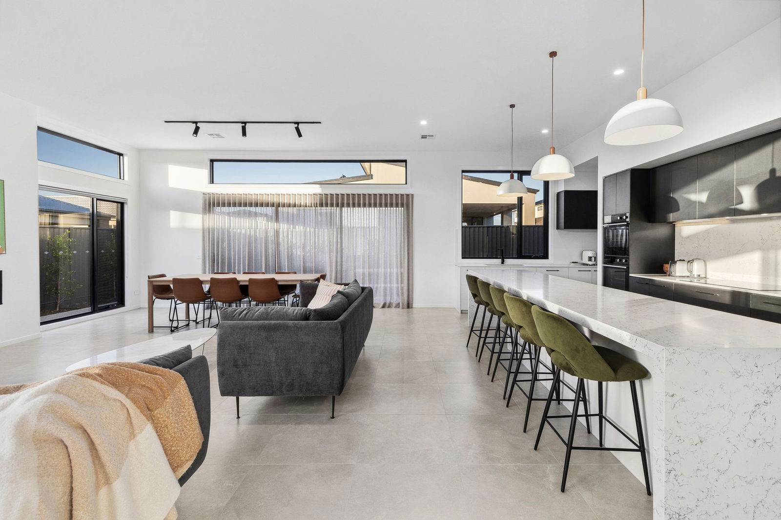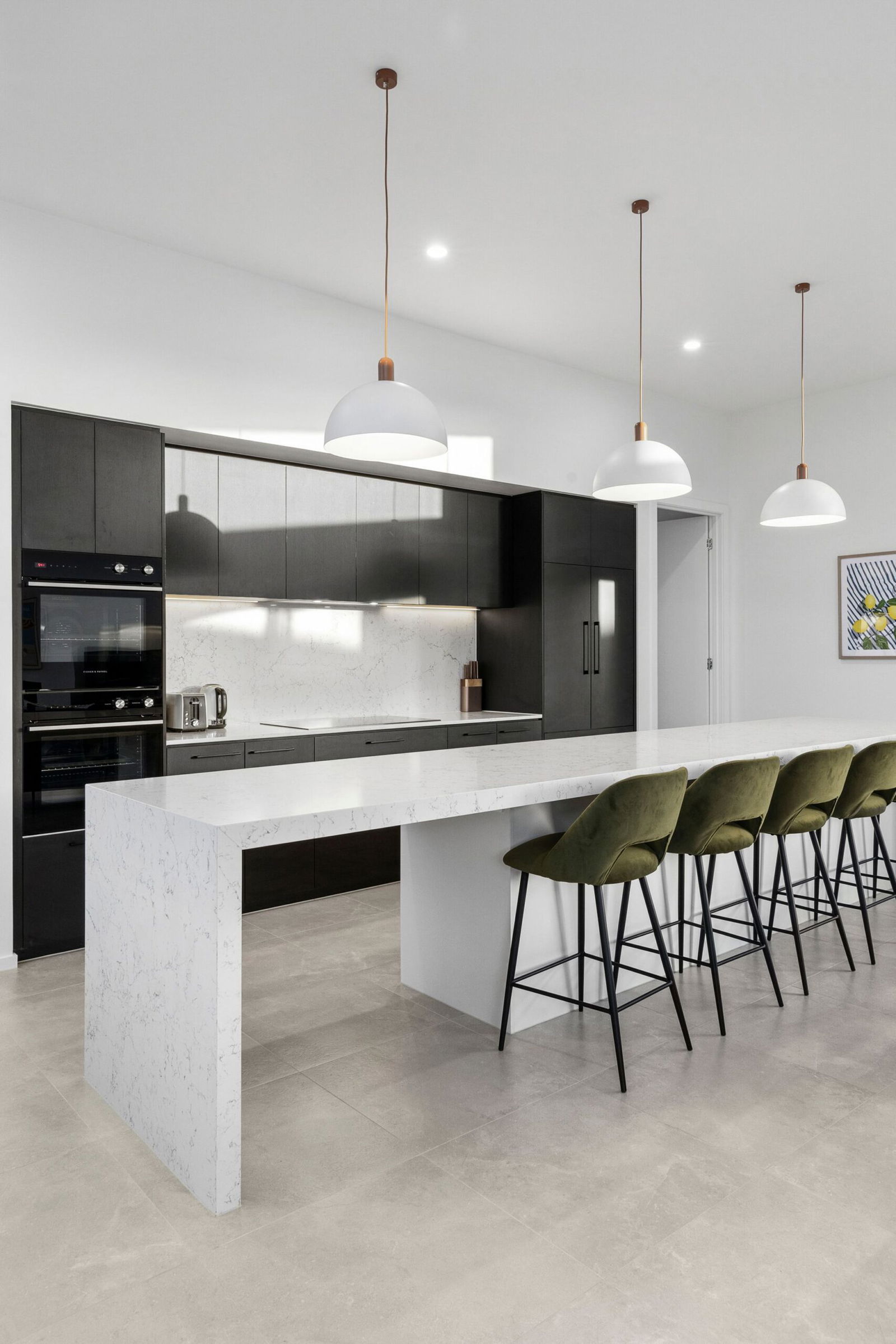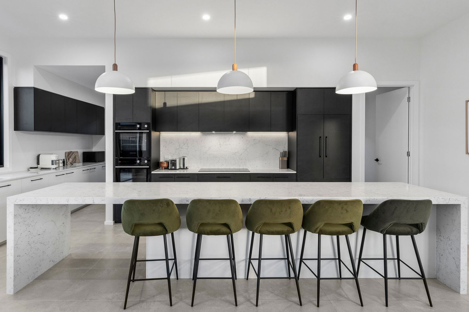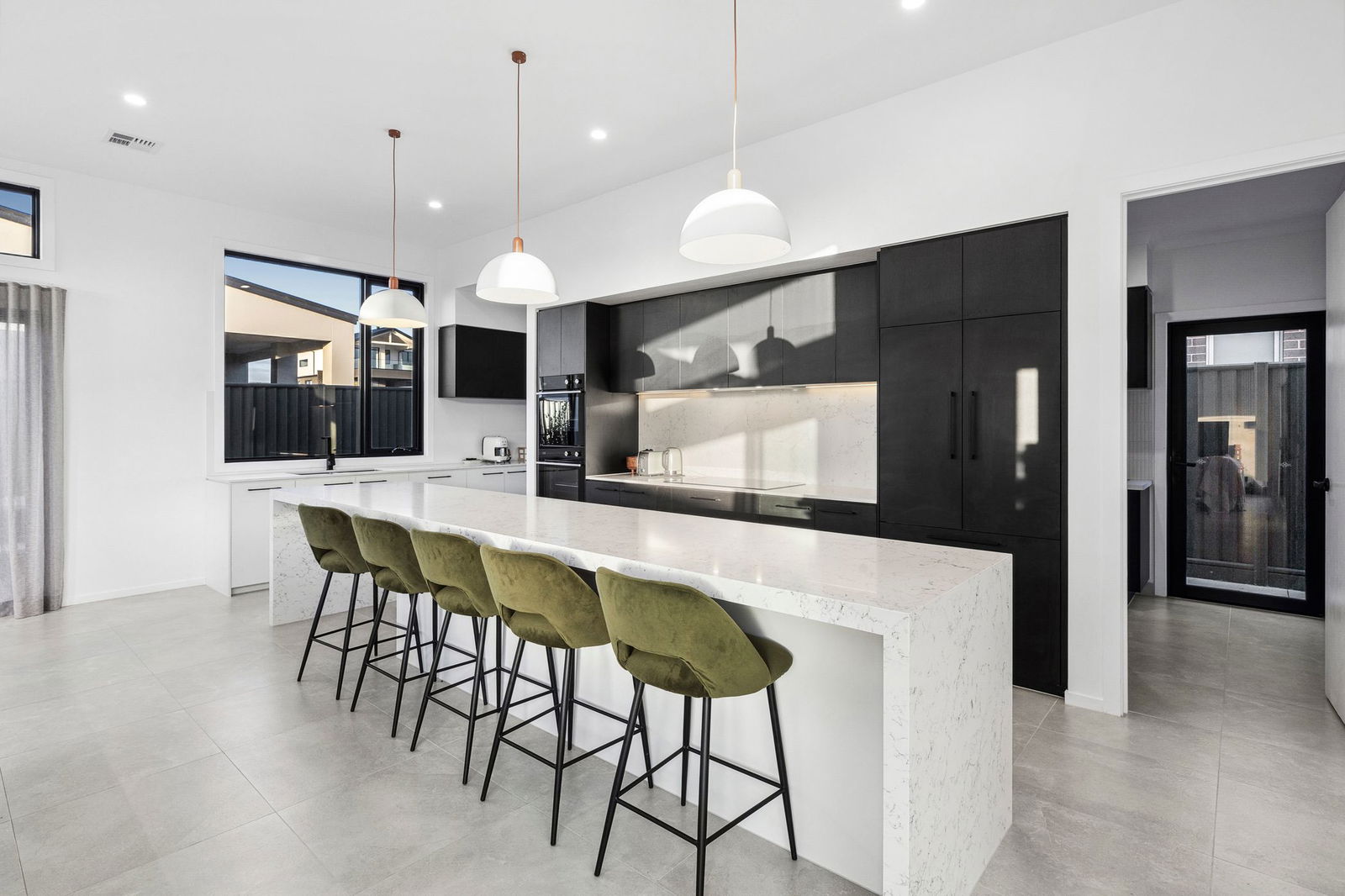 Kitchen – Glamorous entertainers kitchen and meals area with solid stone benchtops and splashback, monochrome cabinetry, high end appliances including a Fisher & Paykel induction cooktop, dual wall ovens, integrated fridge & freezer, integrated dishwasher, bespoke pendant lighting, black tapware and well appointed walk-in pantry
