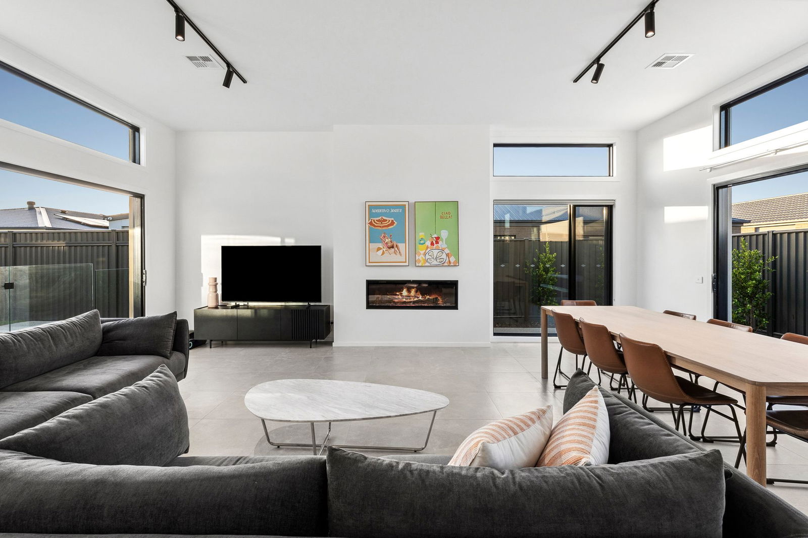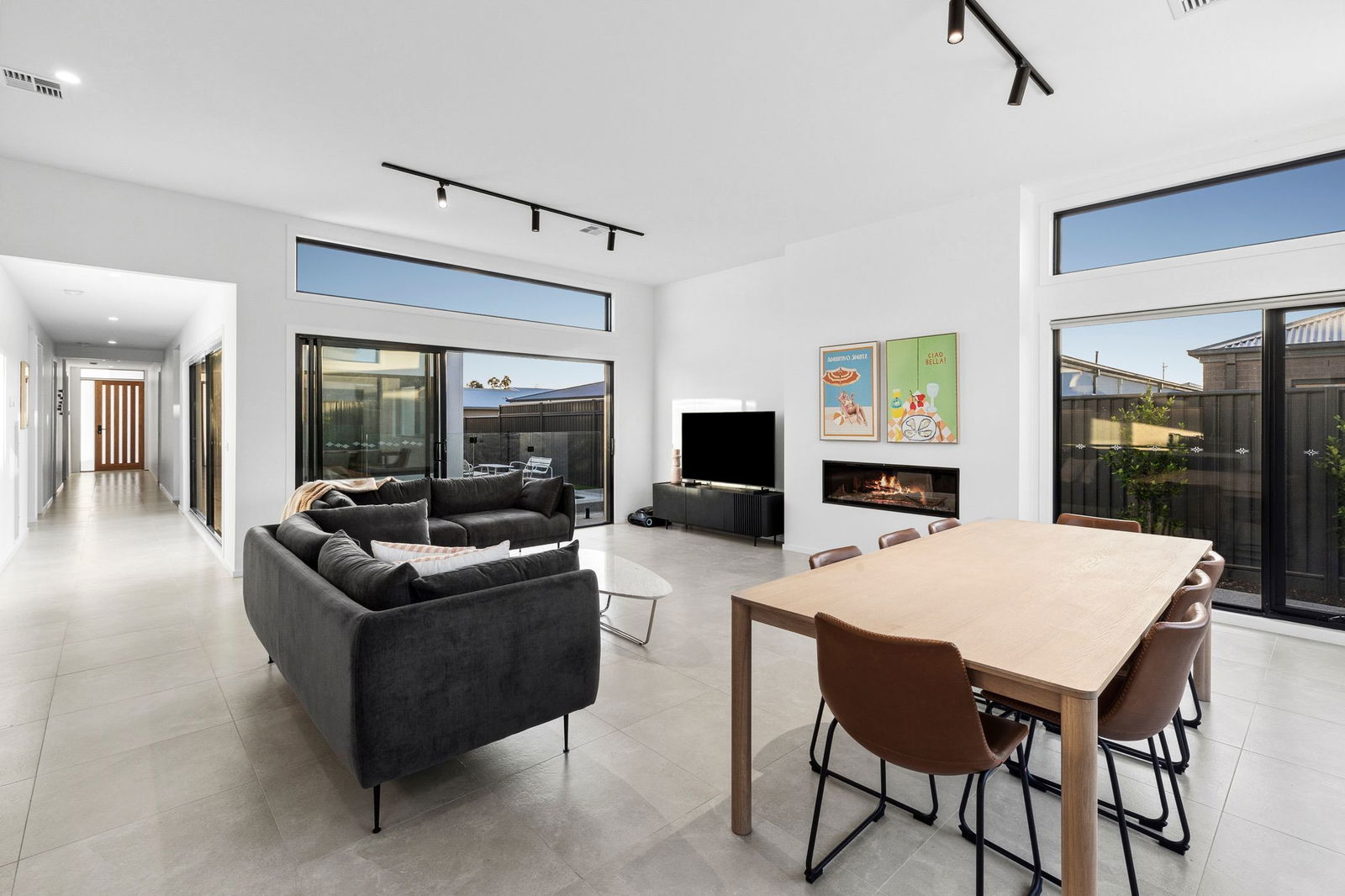 Living/Dining – Vast living and dining area opening to two elevations, heightened ceilings, tiled floor, feature lighting, roller blinds, linen sheers, zoned ducted heating & cooling, gas log fire and flow to the pool area and surrounds