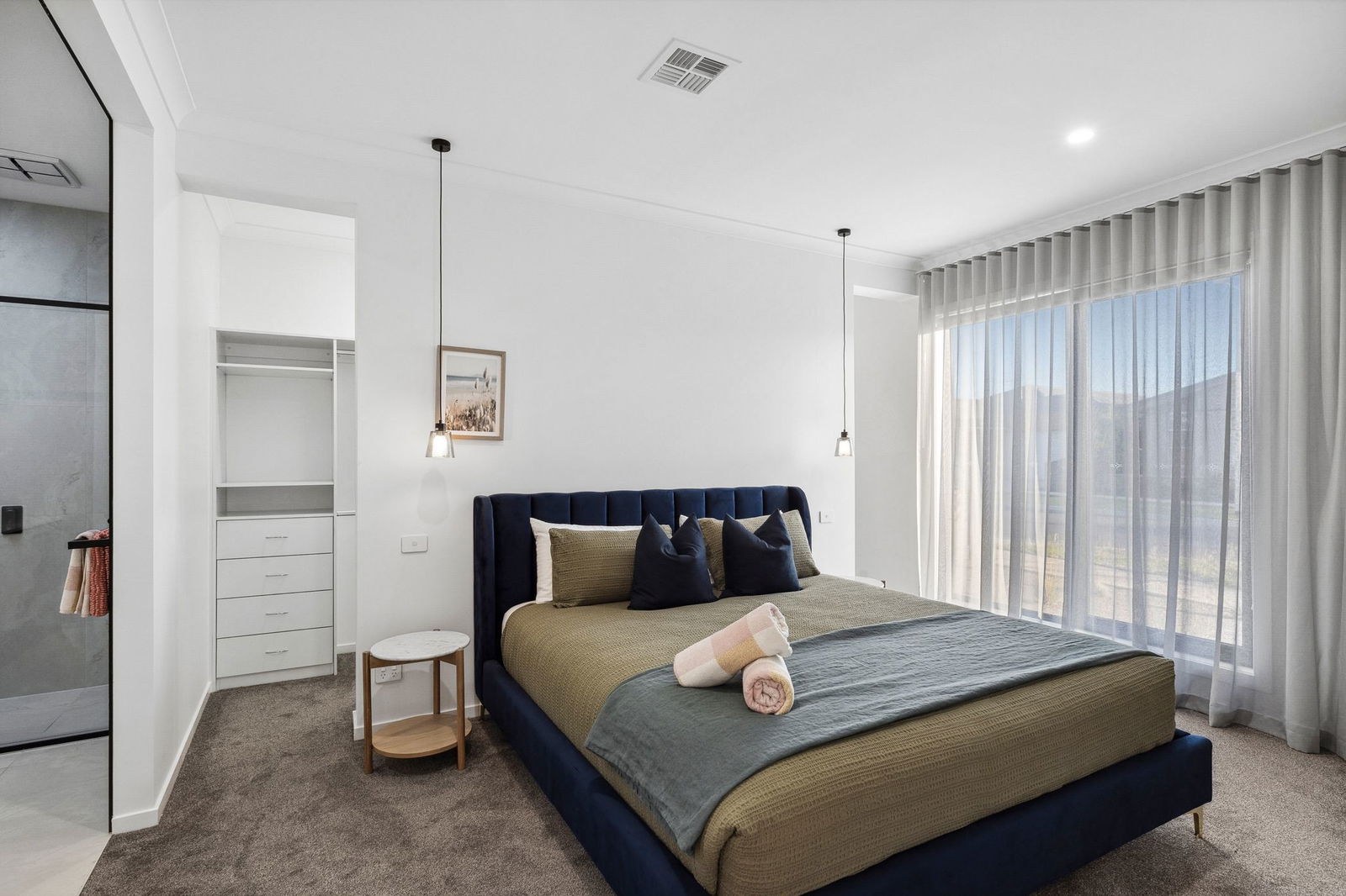 Master Suite – Luxuriously fitted master bedroom with fully- appointed walk through wardrobe, lush carpet, feature pendant lighting, downlights, roller blinds, linen sheers and heightened ceilings. Indulgent ensuite bathroom with floor to ceiling tiles, stone tops, shower, double vanity with LED mirrors, stylish black tapware, skylight and separate toilet
