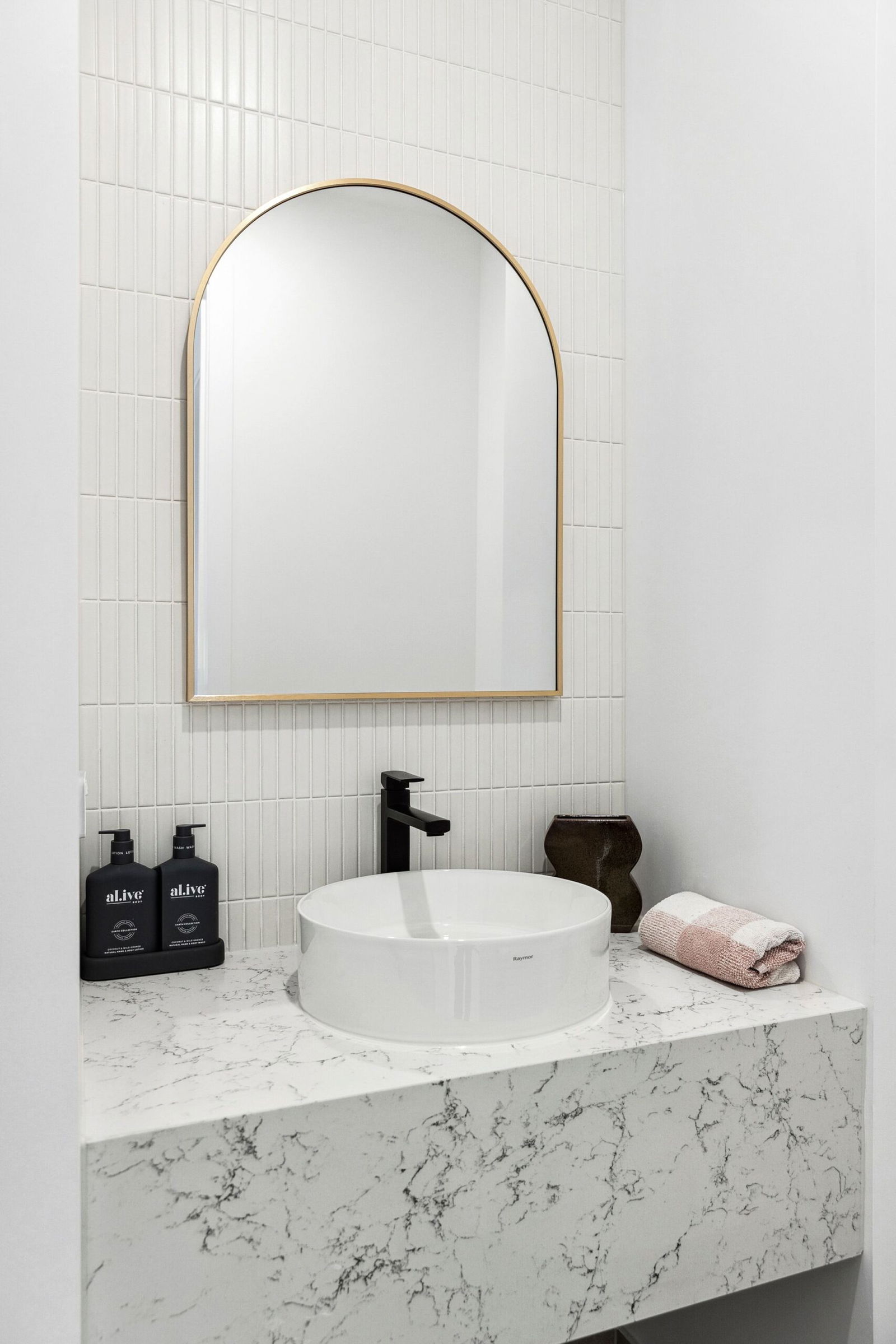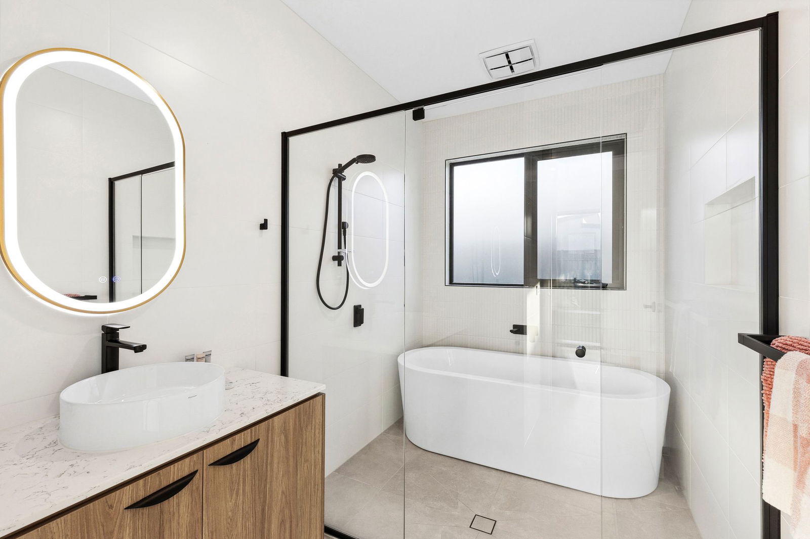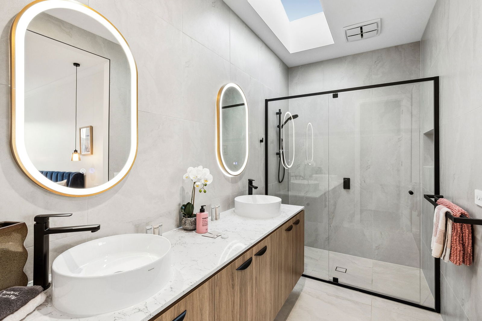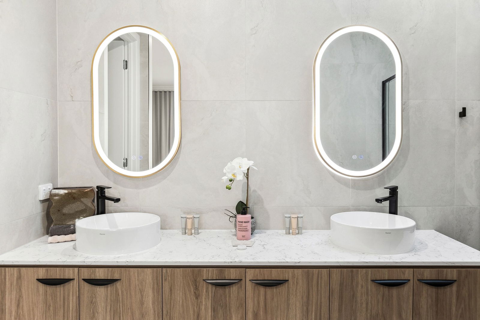 Bathrooms – Spacious, brightly lit bathroom with timber vanity, stone tops, floor to ceiling tiles, black semi-frameless shower screen, shower niche, freestanding bath, LED mirrored vanity and sleek black tapware. Additional powder room with solid stone vanity, feature kit kat splashback tiling, tiled floor, black tapware and w.c