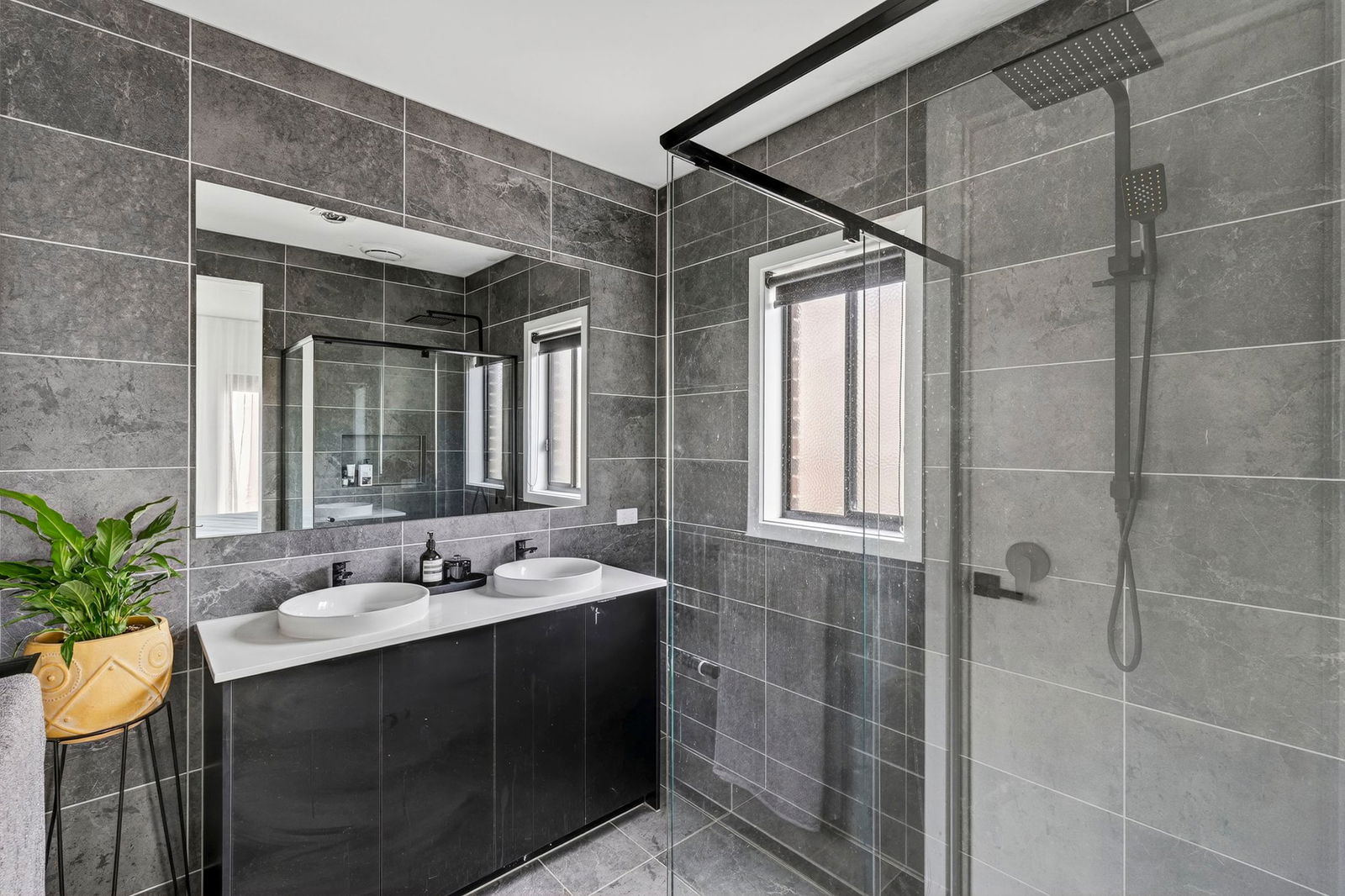 Master Suite: Large picture windows, roller blinds, full-length custom sheer curtain, carpet, and ceiling fan. Walk-in robe and ensuite with full-height tiling, dual vanity with underbench storage, private toilet, and shower with dual heads.