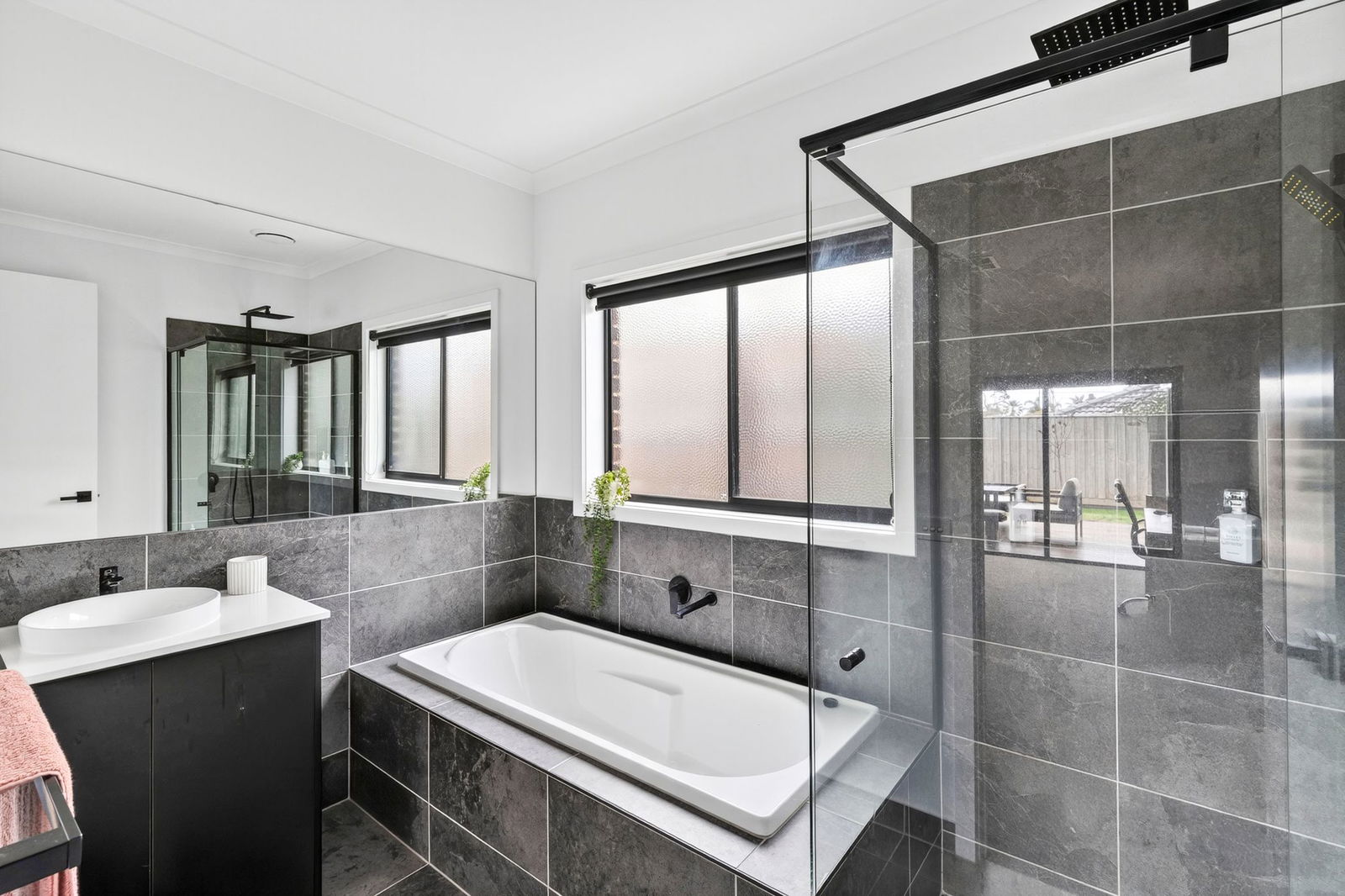 Main Bathroom: Full-height tiling, in-built tub, single vanity with underbench storage, and separate toilet.