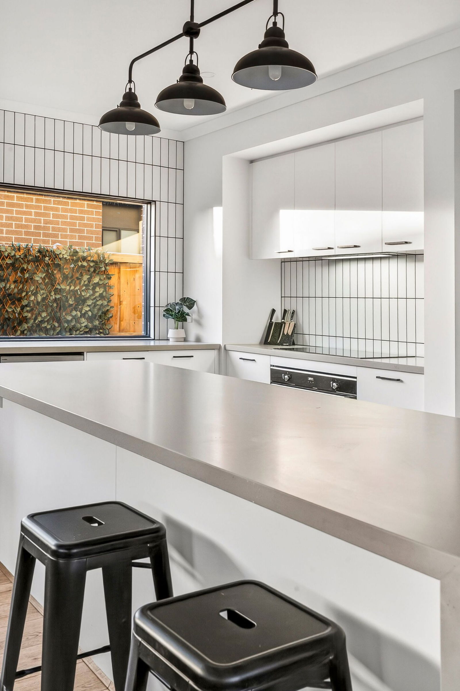Kitchen: Butler’s pantry with additional sink, fridge cavity with plumbing, large island bench with stone waterfall benchtop with breakfast bar overhang, downlights and feature pendant lighting, expansive window splashback with tiled surround, all-electric appliances, and dishwasher.