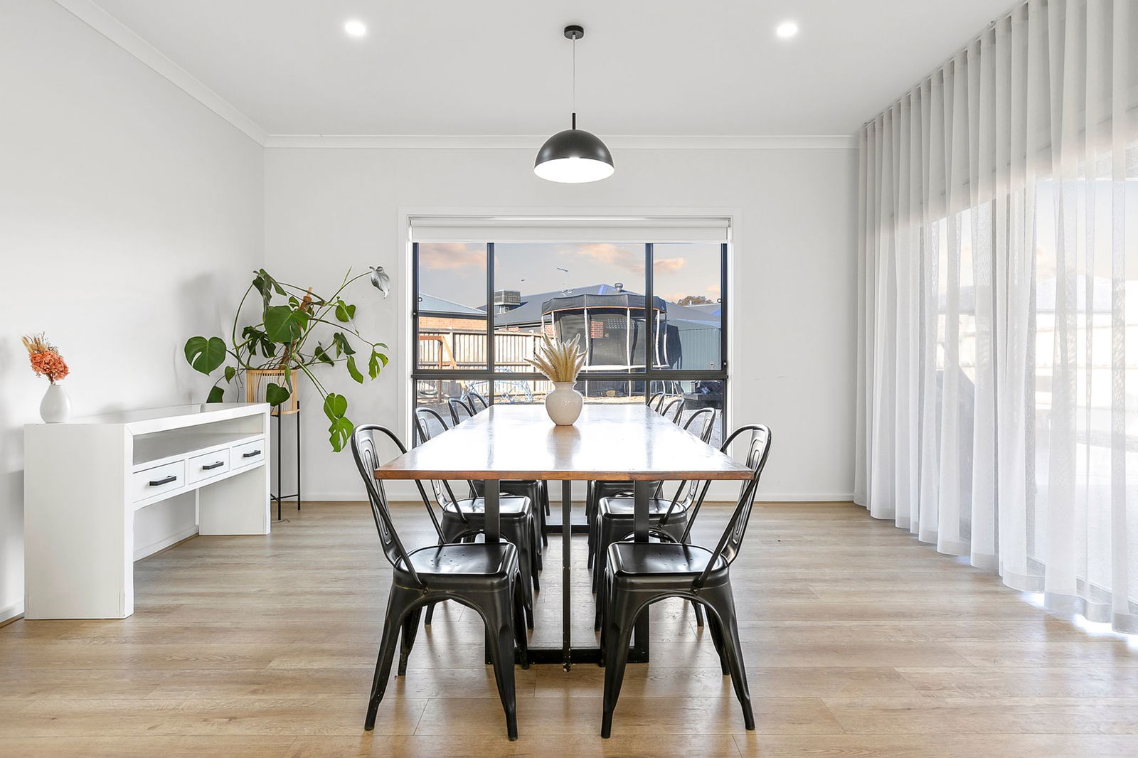 Open Plan Living/Dining: Modern floors, windows with roller blinds, sliding alfresco doors with full-height custom sheer curtains, downlights and feature dining pendant.