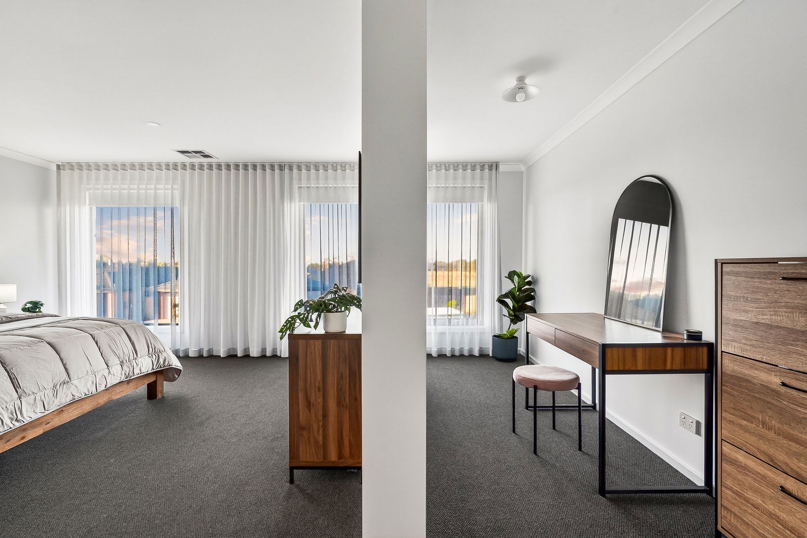 Master Suite: North-facing windows with roller blinds and full-length sheer curtains, downlights, carpet underfoot, permanent room divider with tv point, dual vanity ensuite with double shower, private toilet, and direct walk-in robe access.