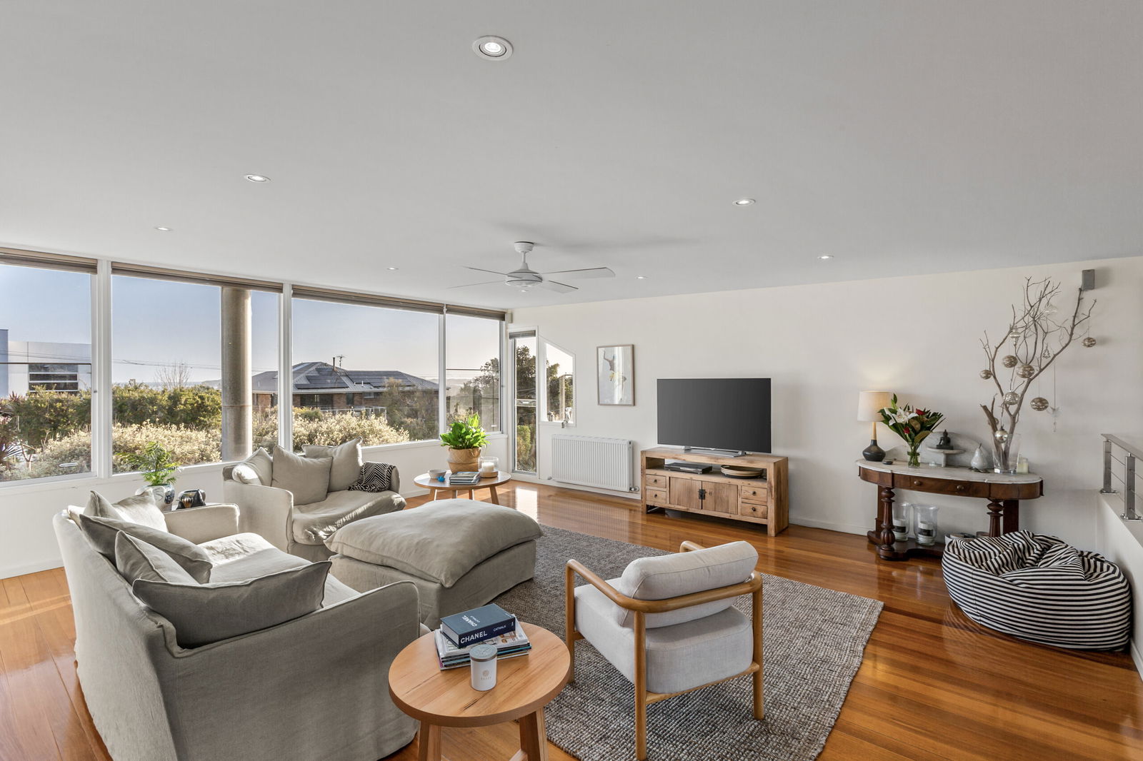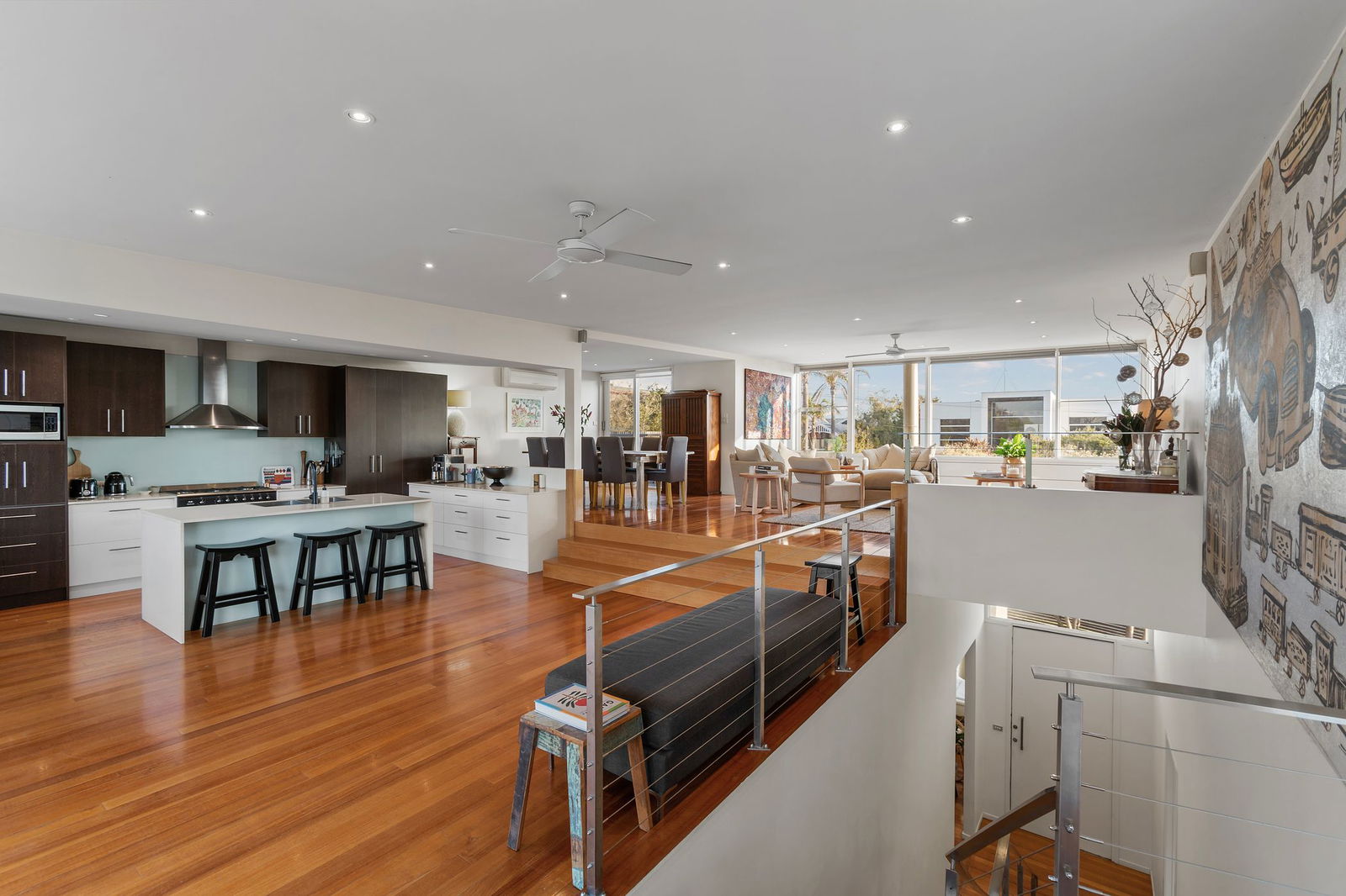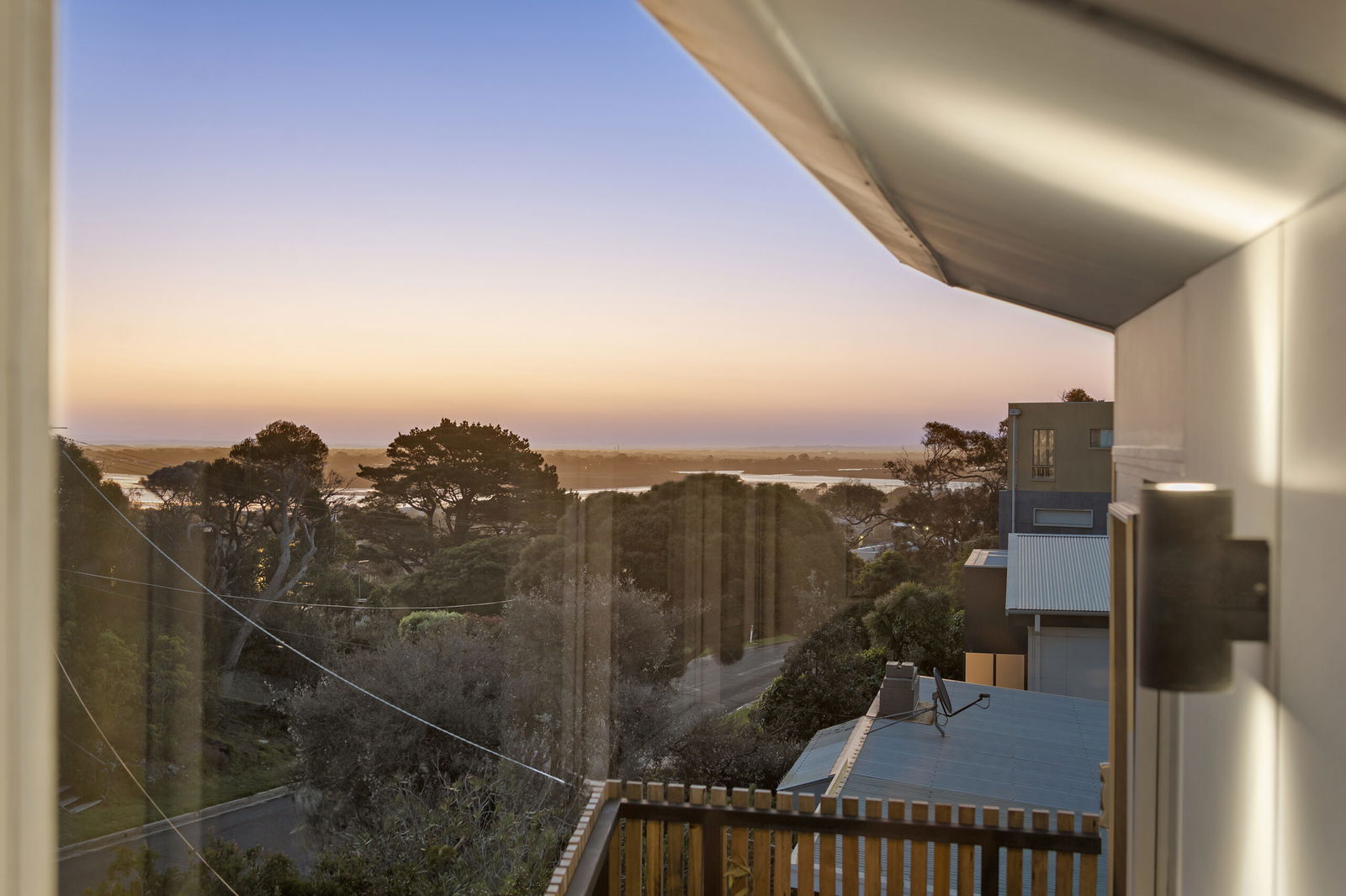 Befitting its elevated position atop one of Ocean Grove’s highest points, this architectural and coastal residence presents a striking blend of resort-style luxury and functional family living. Set across a substantial 849sqm (approx.) north-to-rear allotment, the home captures panoramic views stretching across the Barwon River Estuary, Bluff, and ocean beyond, all within an easy walk to patrolled surf beaches and the vibrant town centre.