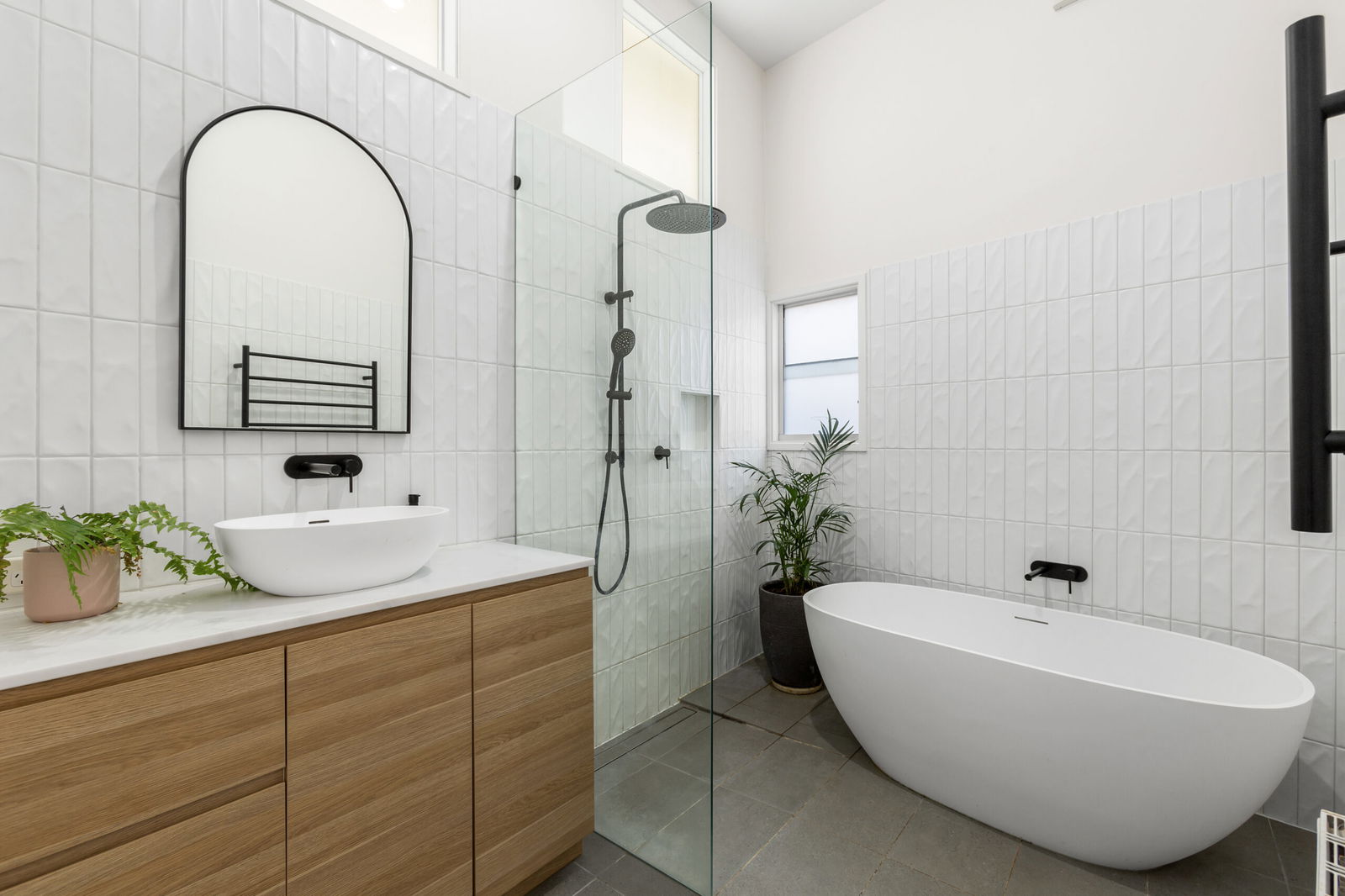 Four oversized bedrooms (or 5 plus home office), each with walk-in robes, positioned alongside a designer family bathroom with freestanding Kado tub, stone-topped vanity, and open shower.