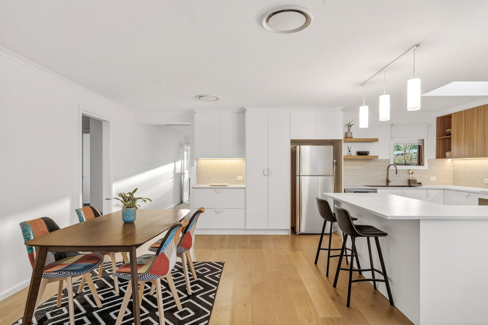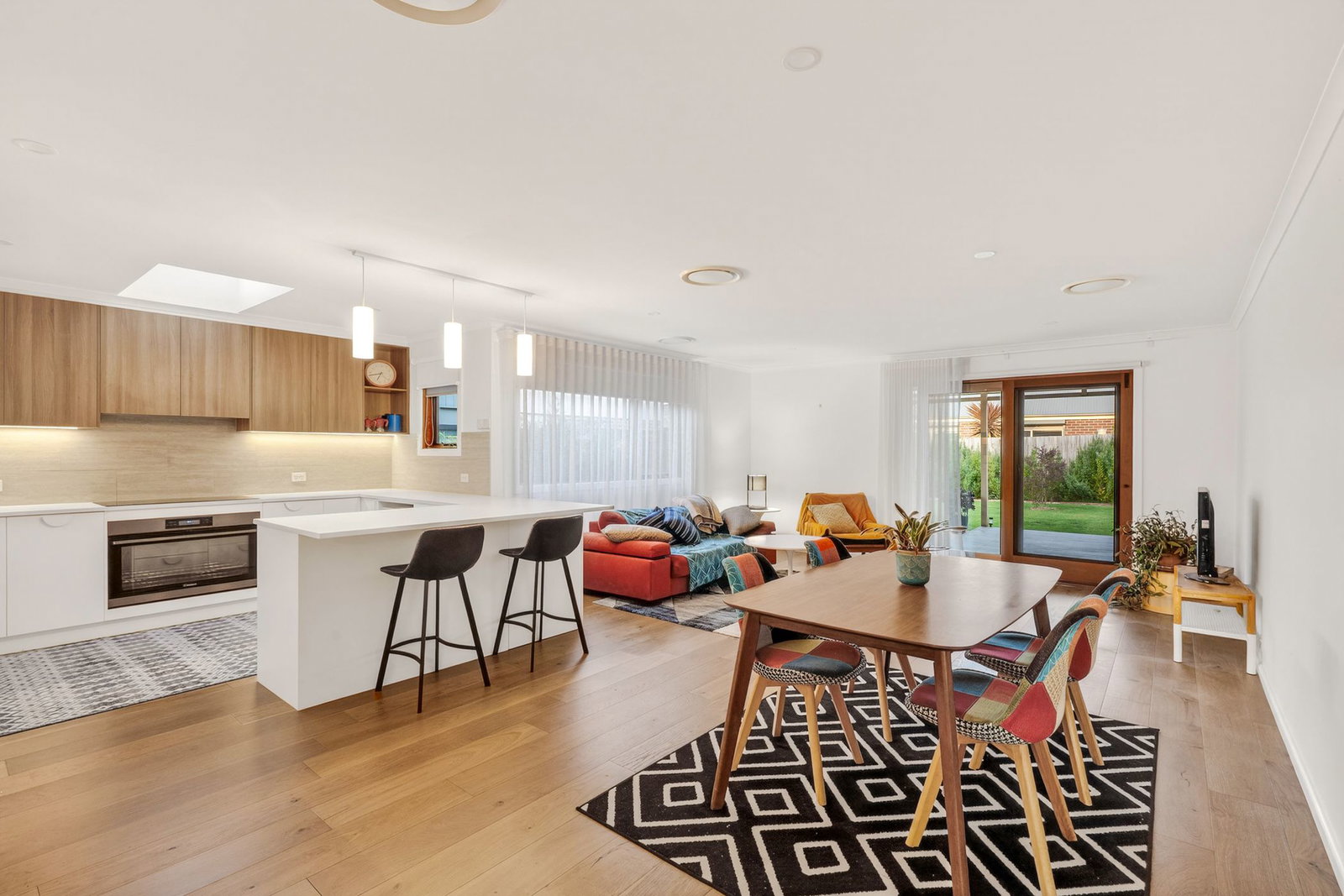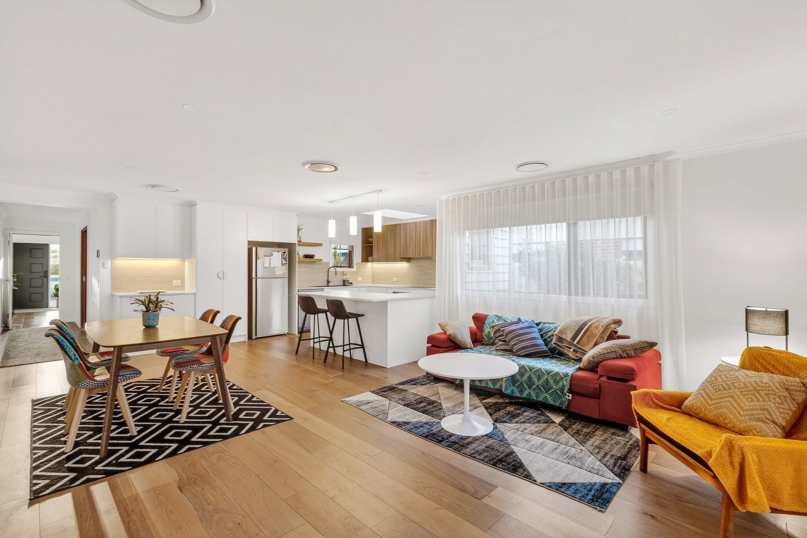 Open Plan Living/Dining: Engineered timber flooring, large window bank and rear timber-framed glass slider, roller blinds and sheer curtains, and downlights.