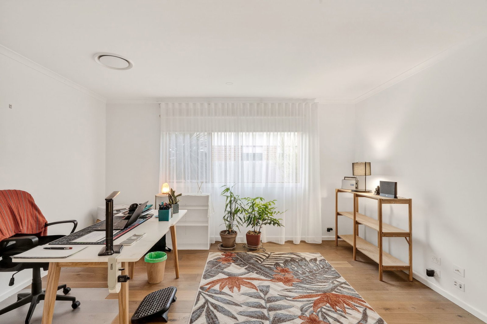 Secondary Living: Engineered timber floors, large window with roller blind and sheer curtain, downlights, and double cavity slider entry.