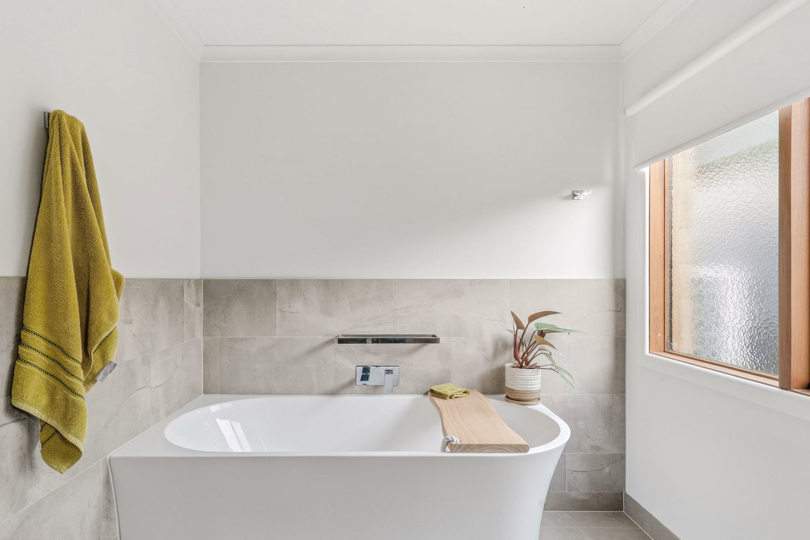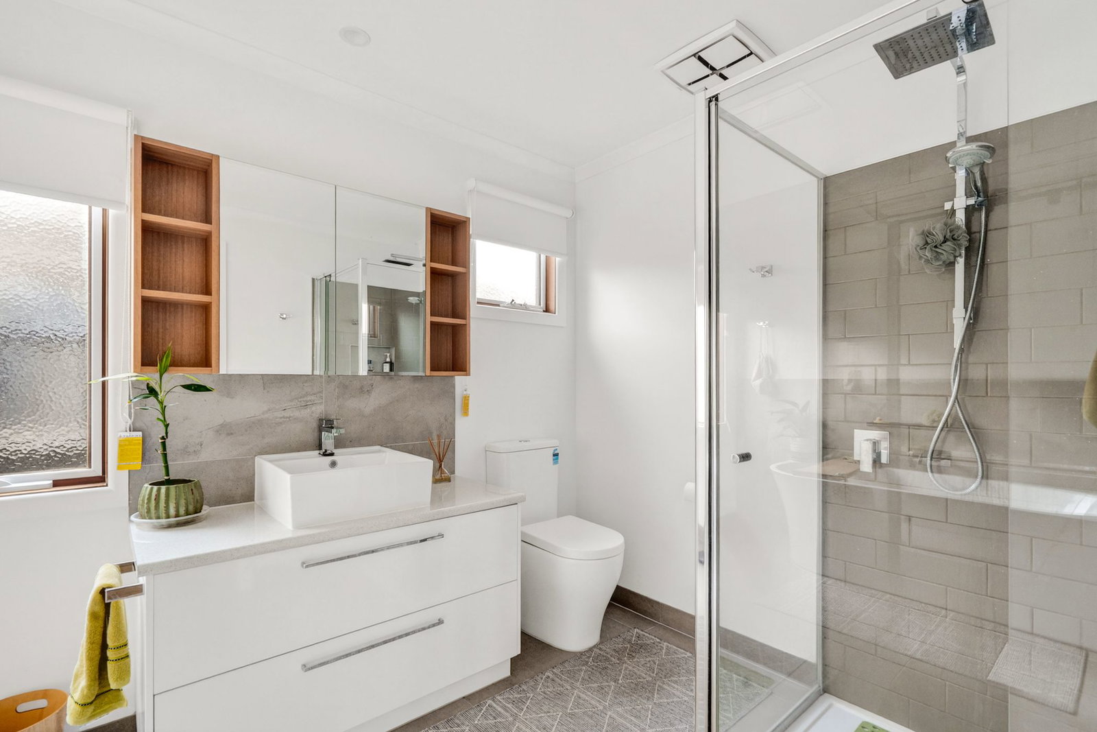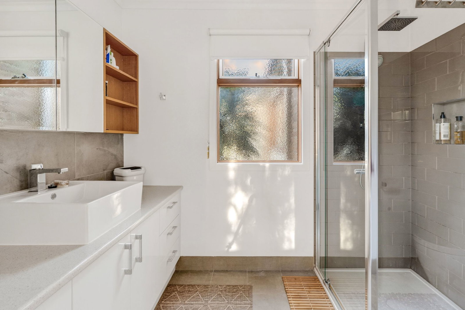 Main Bathroom: Single vanity with underbench storage, toilet, shower with wall niche and double rail head, wall mirror with concealed storage, open shelving, window with privacy glass, and a feature tub.