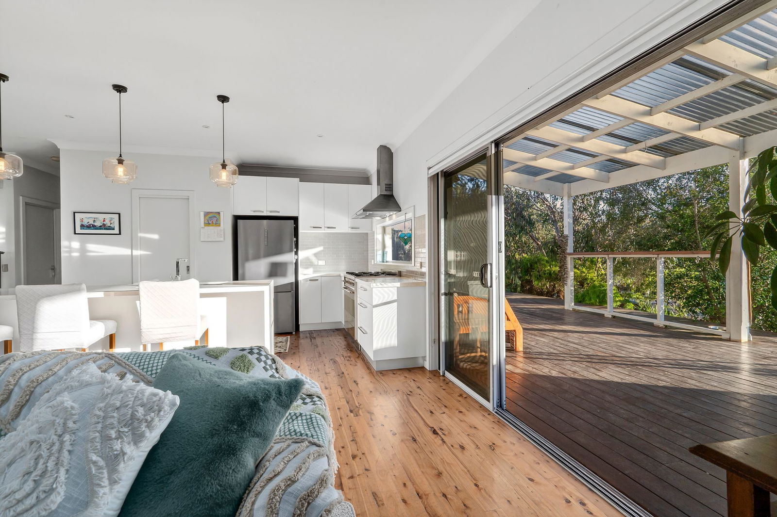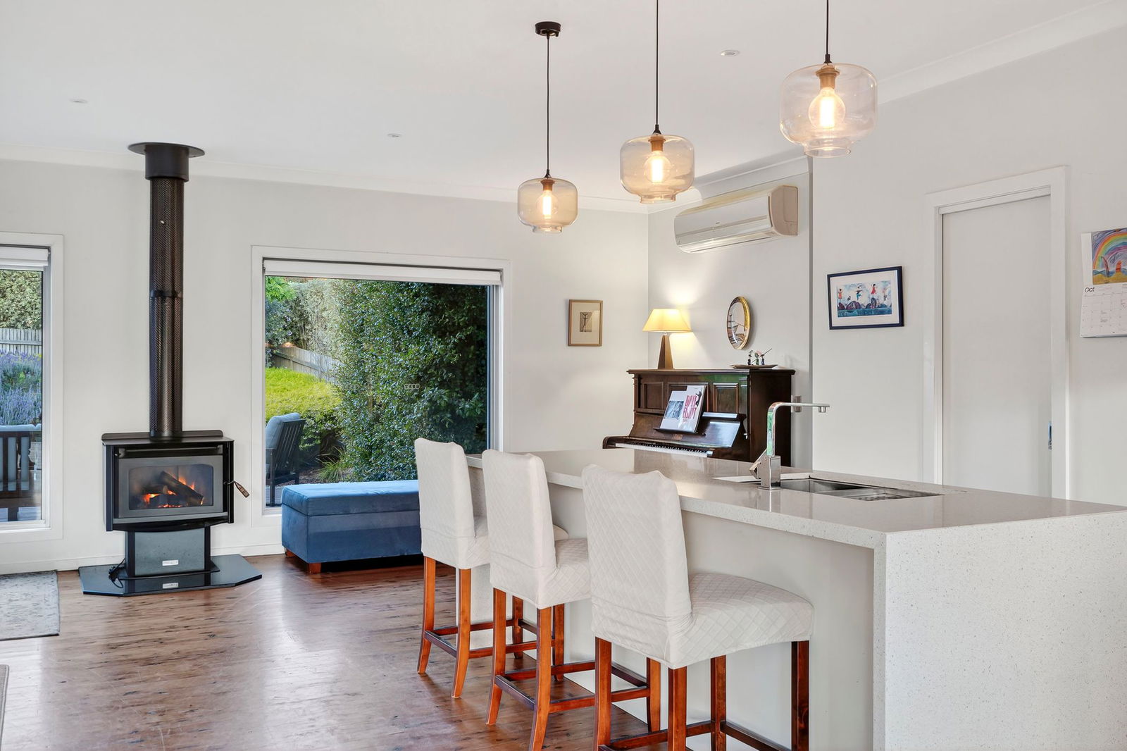 Living/Dining – Open plan living and dining area, timber flooring, downlights, roller blinds, wood fire, split system air conditioning, ceiling fan, sliding doors opening up onto the outdoor entertaining deck