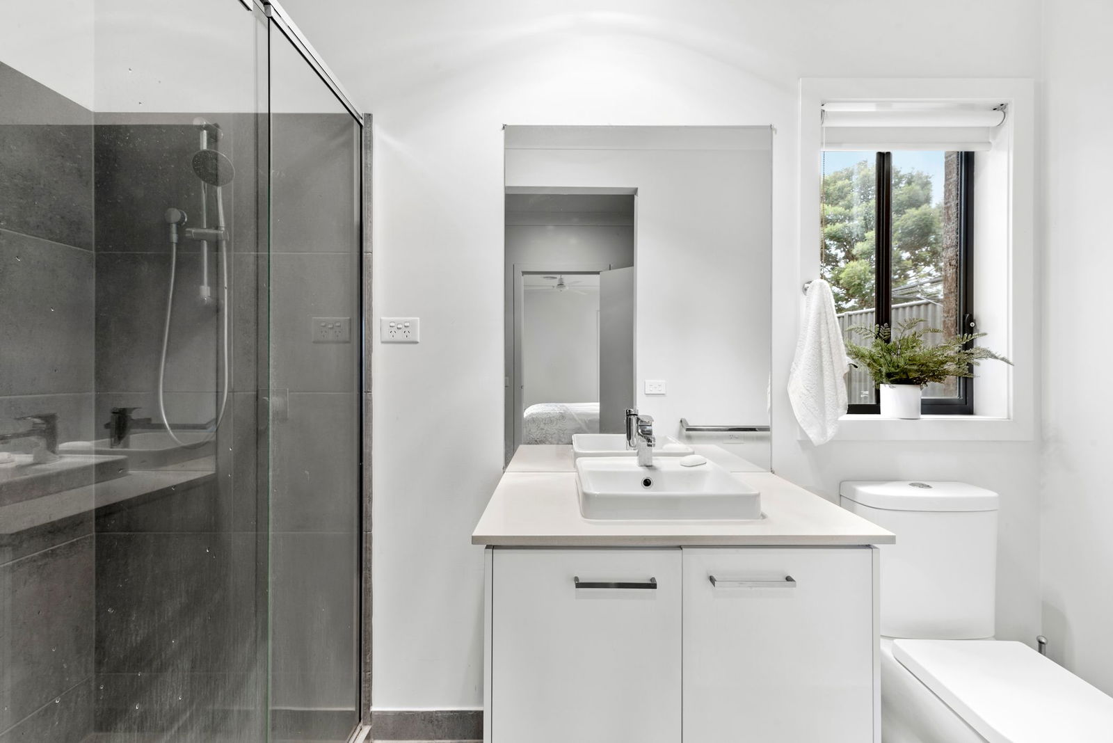 Master Suite – Private spacious master bedroom with walk in robe, carpet, blinds, downlights, ducted heating and cooling, ensuite with neutral color palette, shower, single vanity with mirrored splashback and toilet