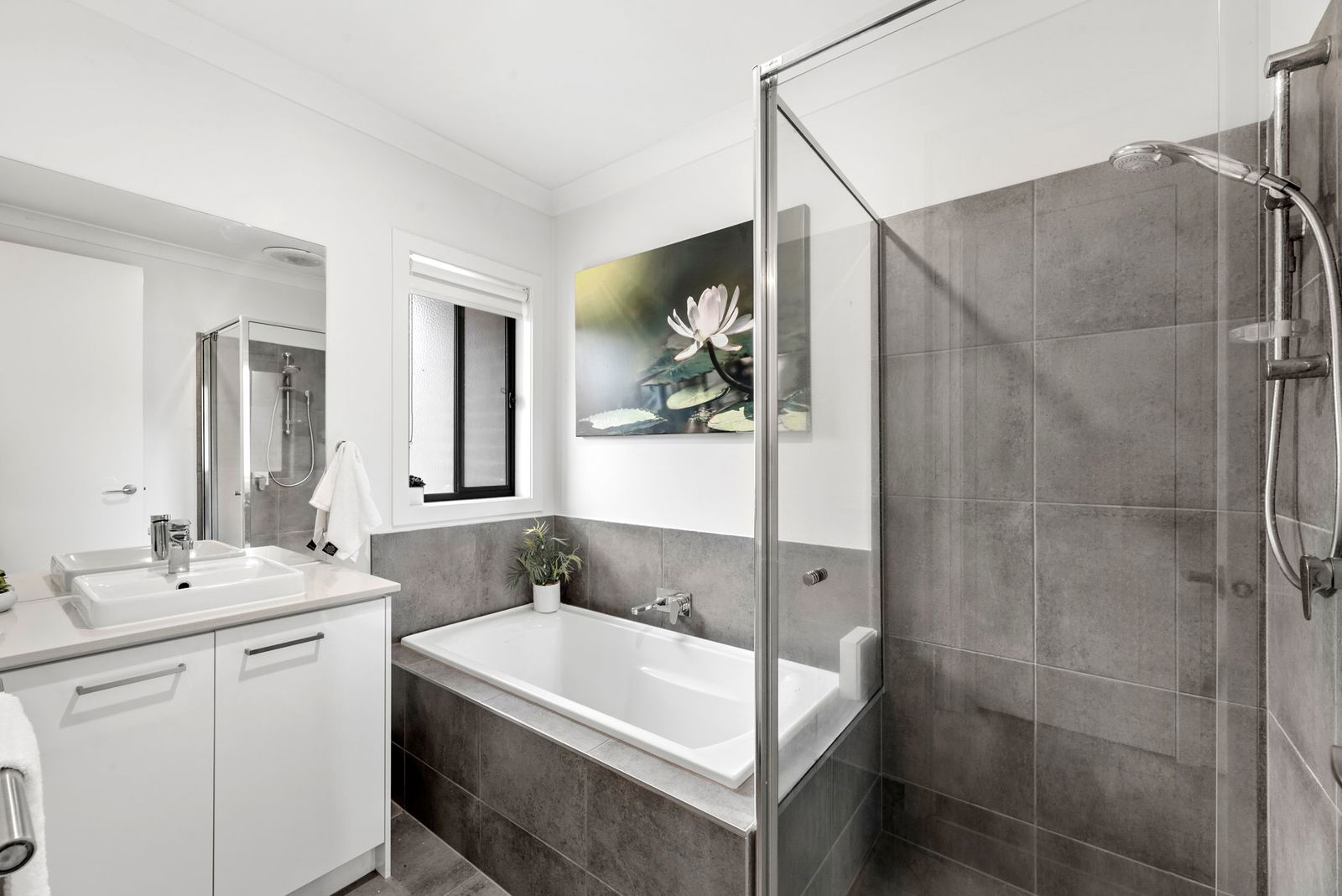 Main Bathroom – Contemporary looking bathroom with built-in bath, single vanity & shower