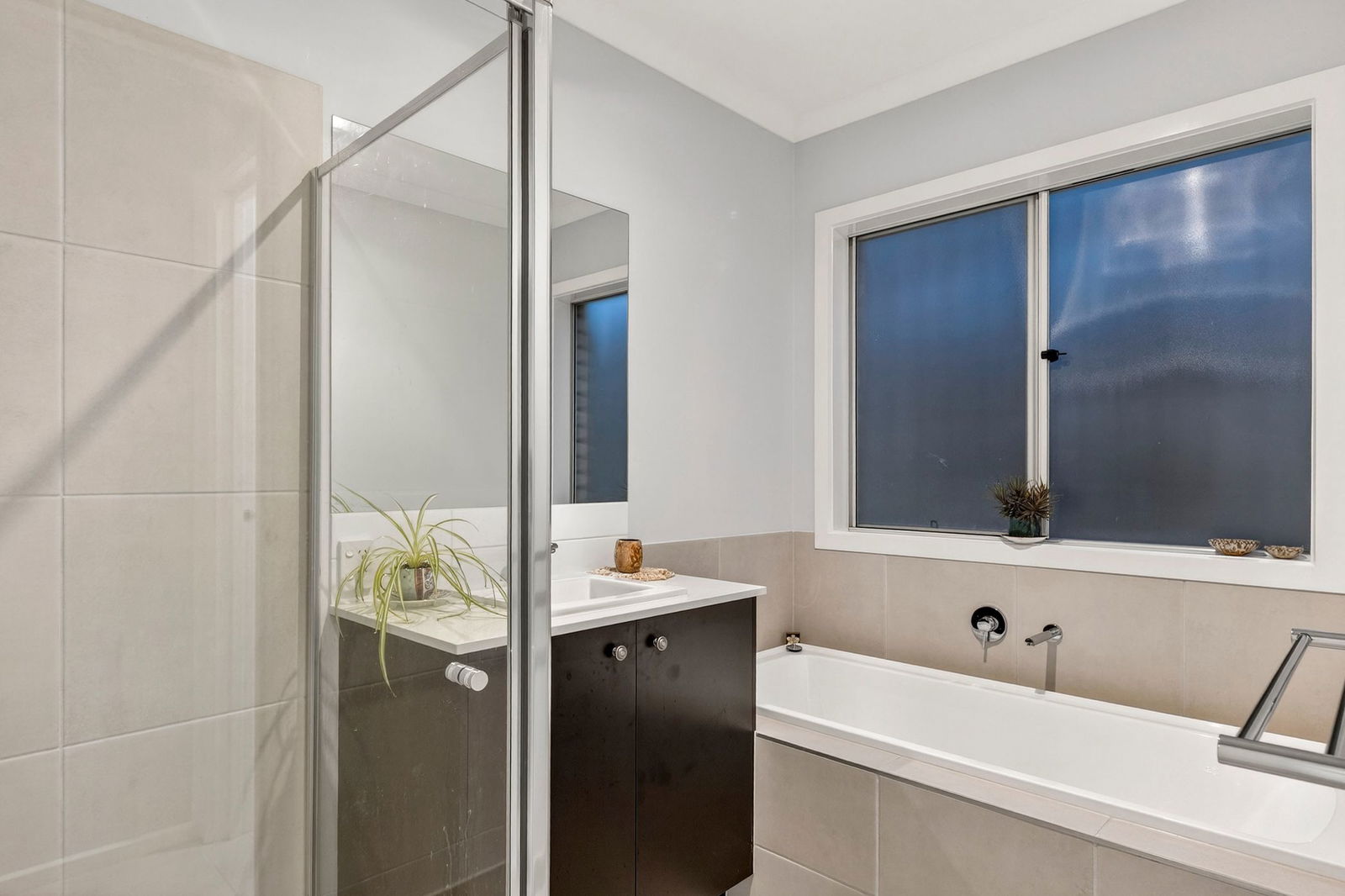 Main Bathroom: Bathtub with tiled surround, single vanity with underbench storage, standard shower, window with privacy glass, and separate toilet.