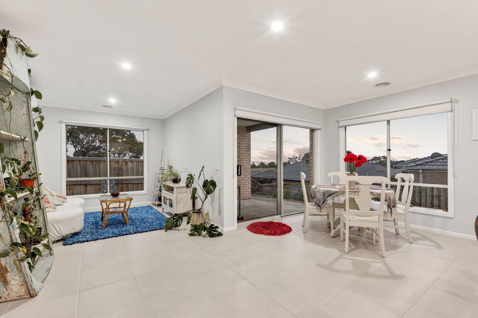 Open Plan Living/Dining: Dual window banks with north-facing views toward the bay, glass sliding door to covered alfresco, tiled floors, downlights, and roller blinds.