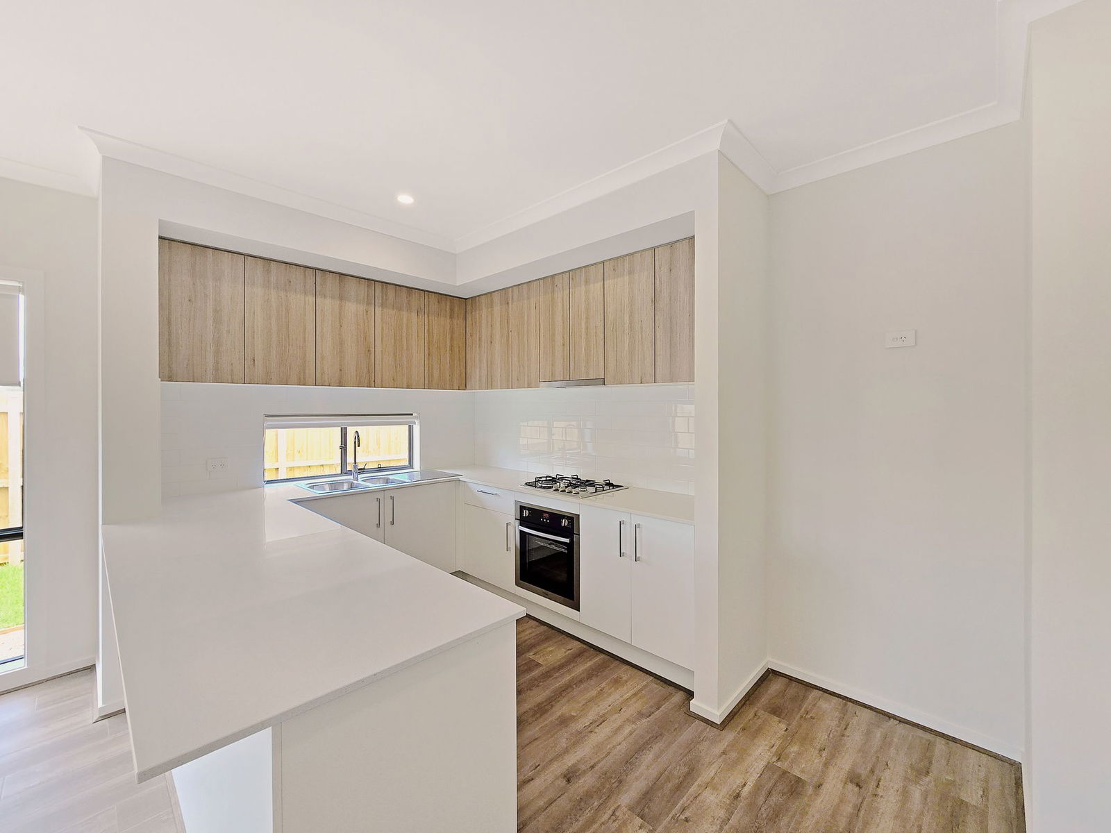20mm stone benchtops, stainless steel appliances, gas cooktop, underbench oven, tiled splashback, ample overhead and underbench cabinetry, laminate timber flooring, window for natural light, and a functional layout overlooking the living and dining zone.