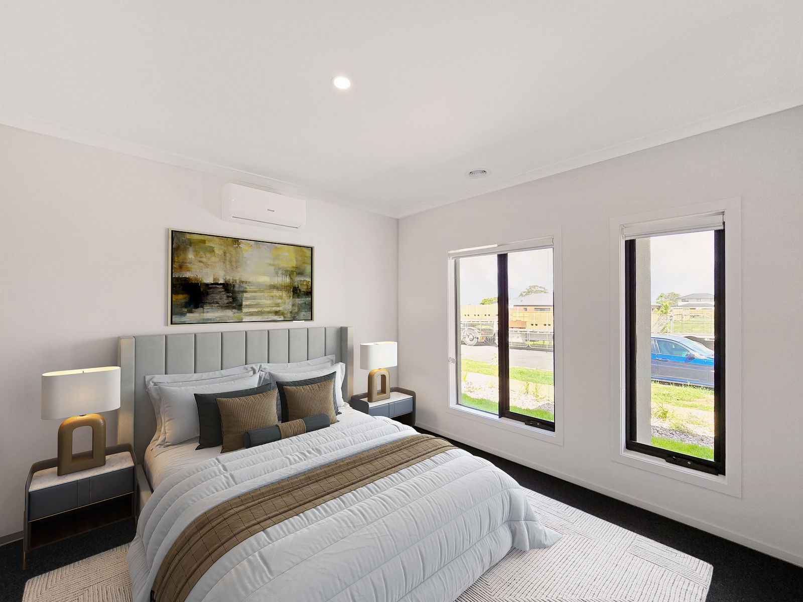 Carpet underfoot, walk-in robe, split-system heating and cooling, and a private ensuite featuring stone benchtops, modern fixtures and a walk-in shower.