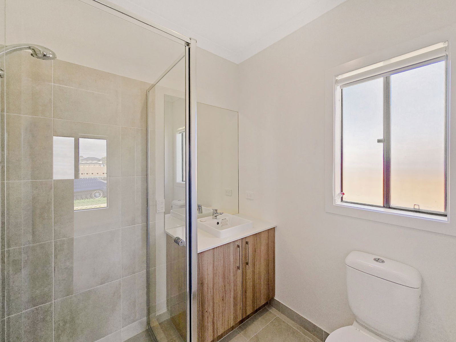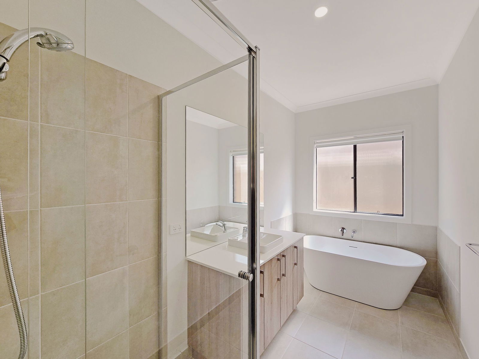 Stone benchtops, walk-in shower, separate bathtub, contemporary tiling, and a separate toilet for added functionality.