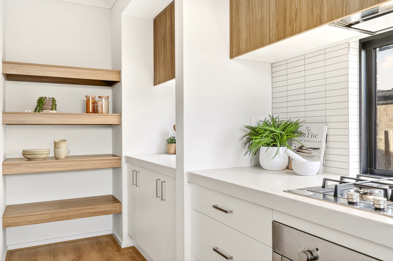 Kitchen: Luxury stone benchtops with breakfast overhang, 900mm underbench oven and gas cooktop, splashback window, extensive storage including overhead cupboards, microwave and fridge cavity, in-set sink with chrome tapware, butler’s pantry with open pantry shelving, and kit-kat splashback tiling.