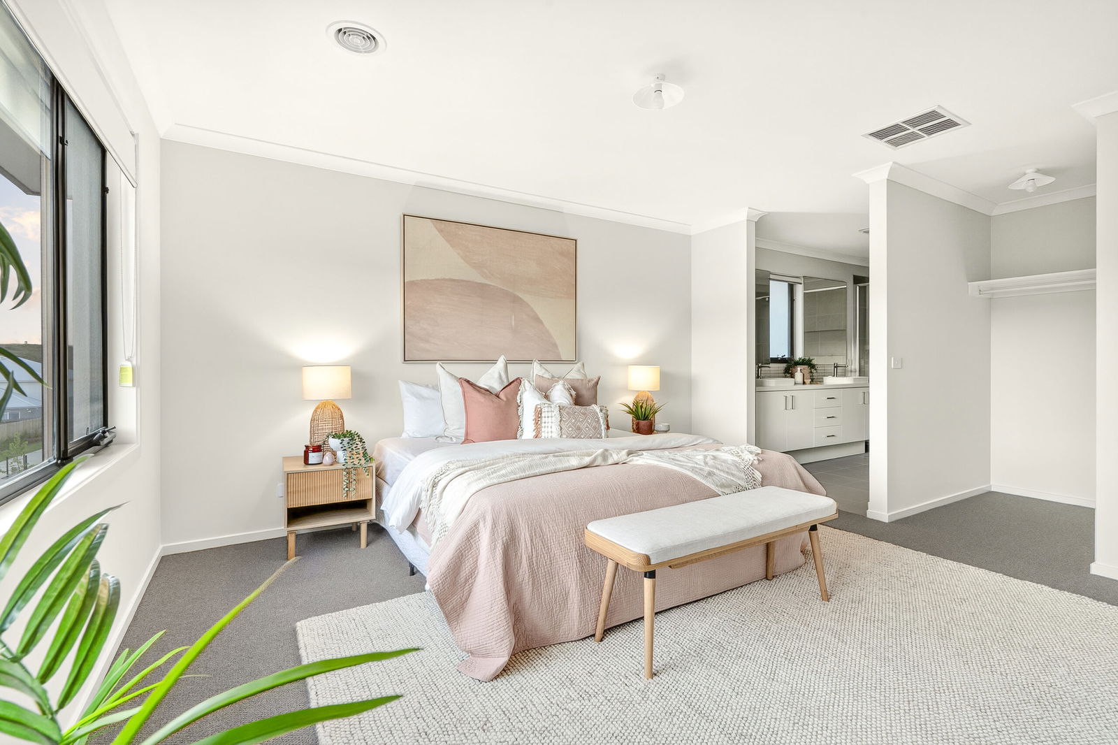 Master Suite: Carpet underfoot, street-facing windows with elevated aspect, block-out roller blinds, ‘his and her’ walk-in robes, and ensuite featuring dual vanity with underbench storage, oversized shower with wall niche and tiled base, twin mirrors, and private toilet.