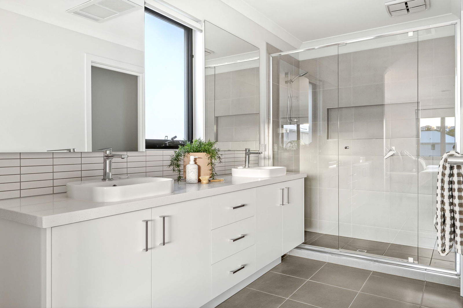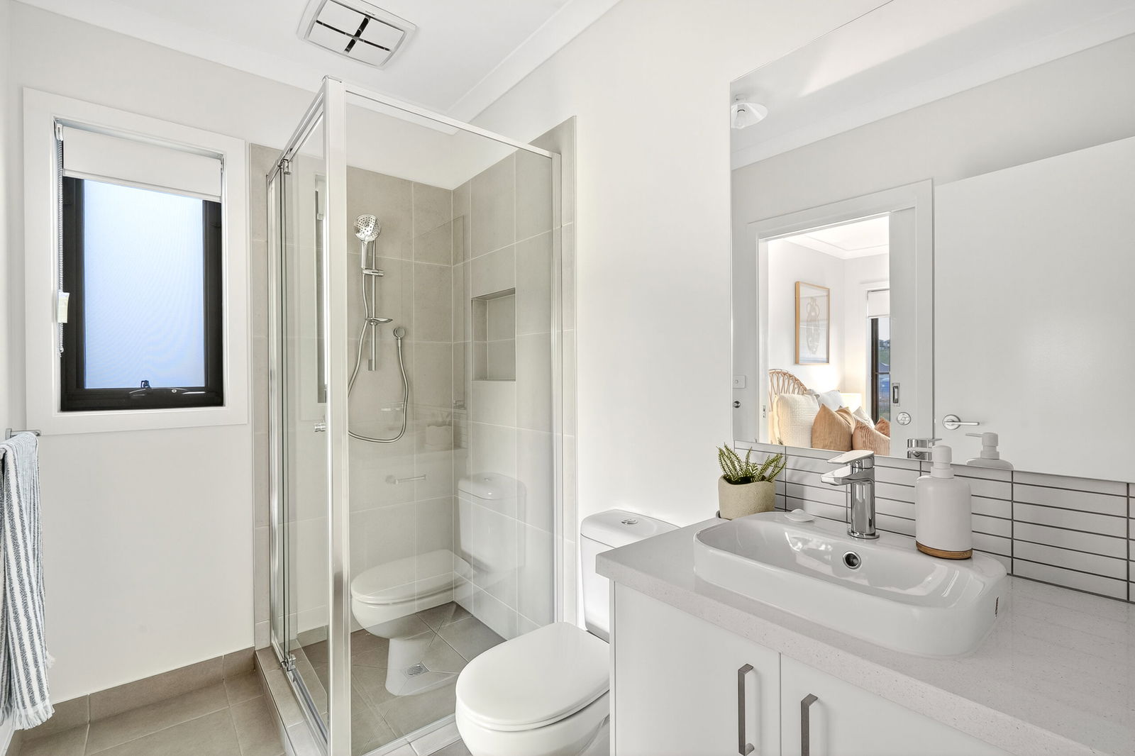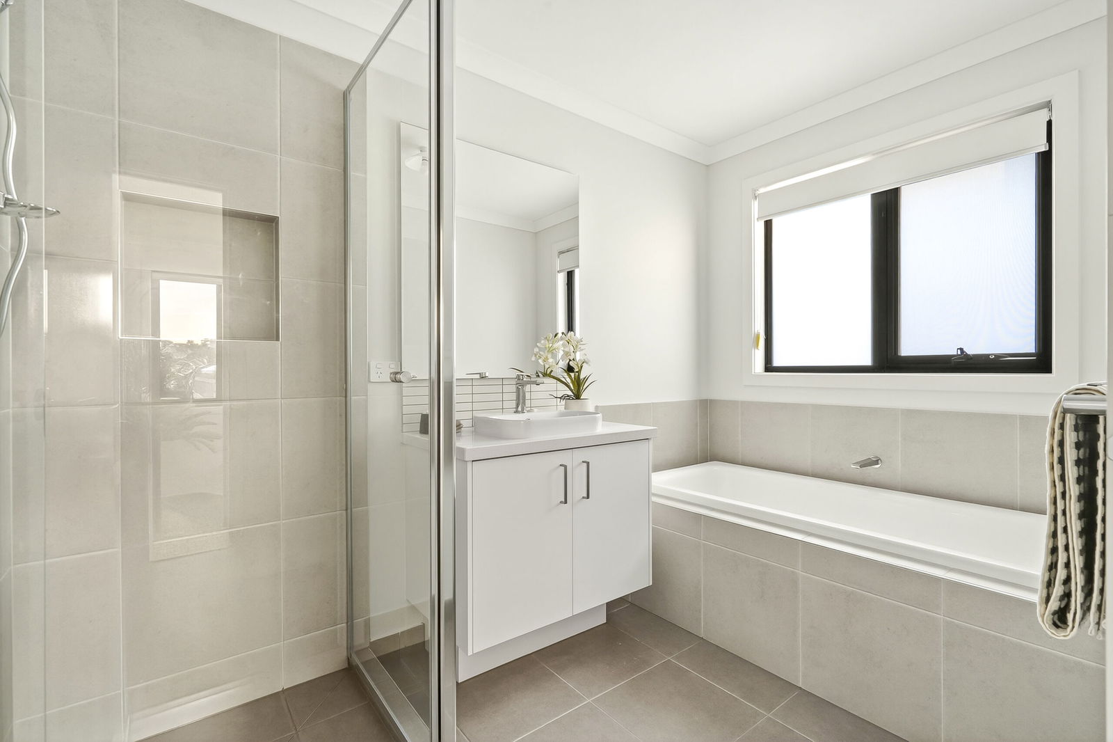 Main Bathroom: Built-in tub, single vanity with underbench storage, shower with wall niche and tiled base, and separate toilet.