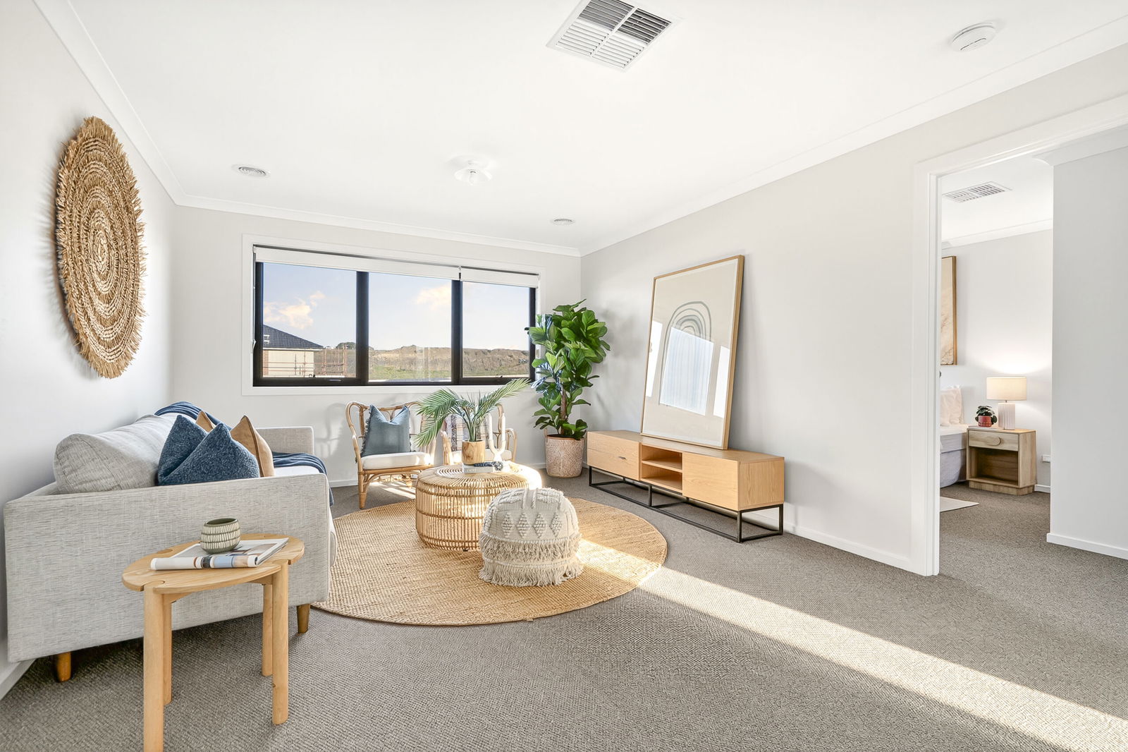 Luxury Inclusions: Study nook, walk-in linen, laundry, gas ducted heating, evaporative cooling, understair storage, carpeted staircase with double-height void, premium carpet throughout, and double garage with internal access.