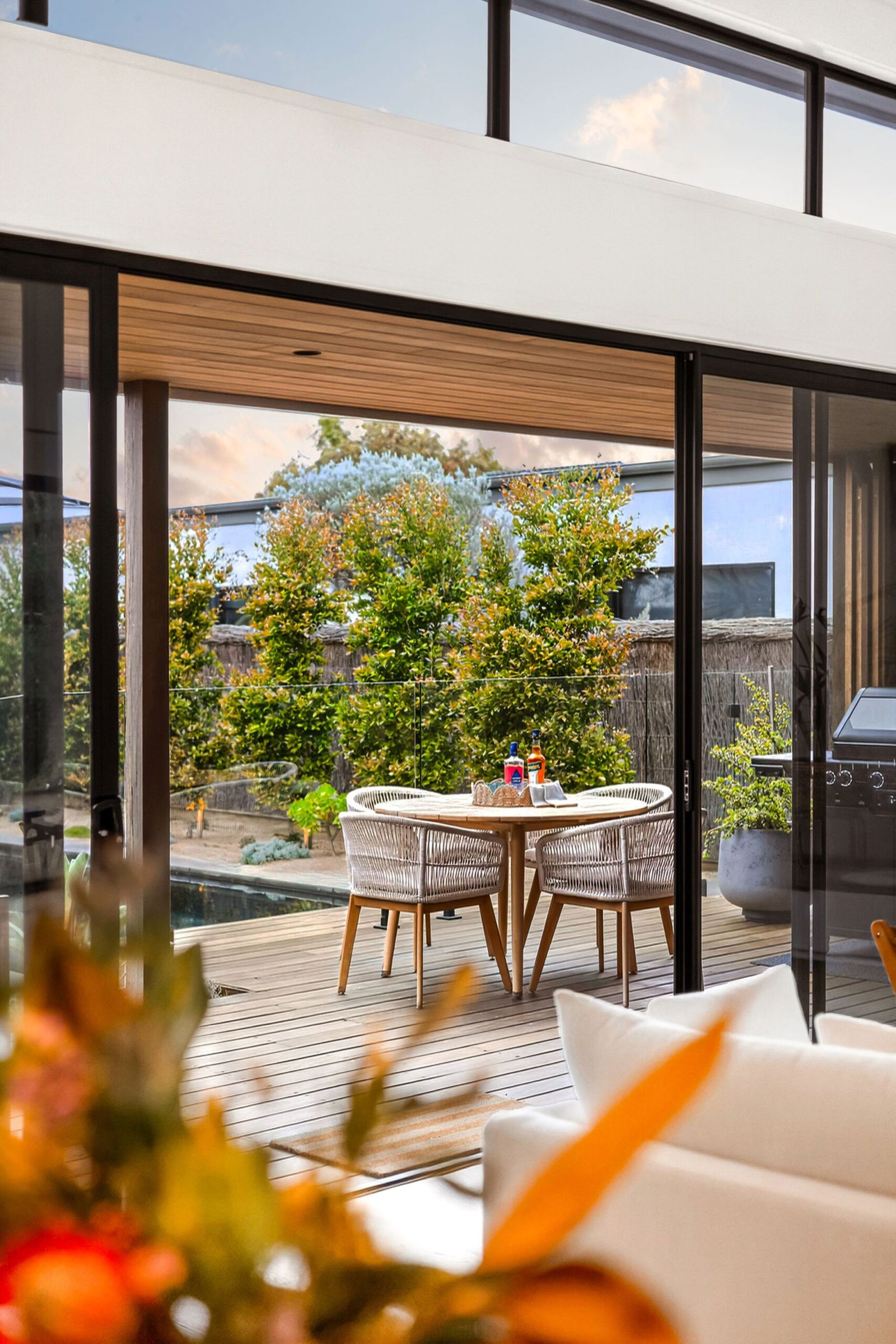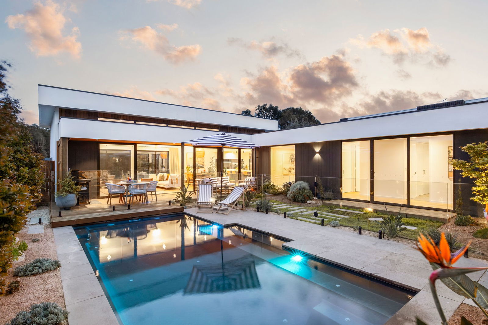 Outside: Impressive landscaped gardens stretch the entire 744sqm (approx.) allotment, remaining open to the rear reserve and golf course for the most magical of aspects. A central in-ground pool brings family and friends together in a private setting, where gardens marry with outdoor space to sit and relax.
