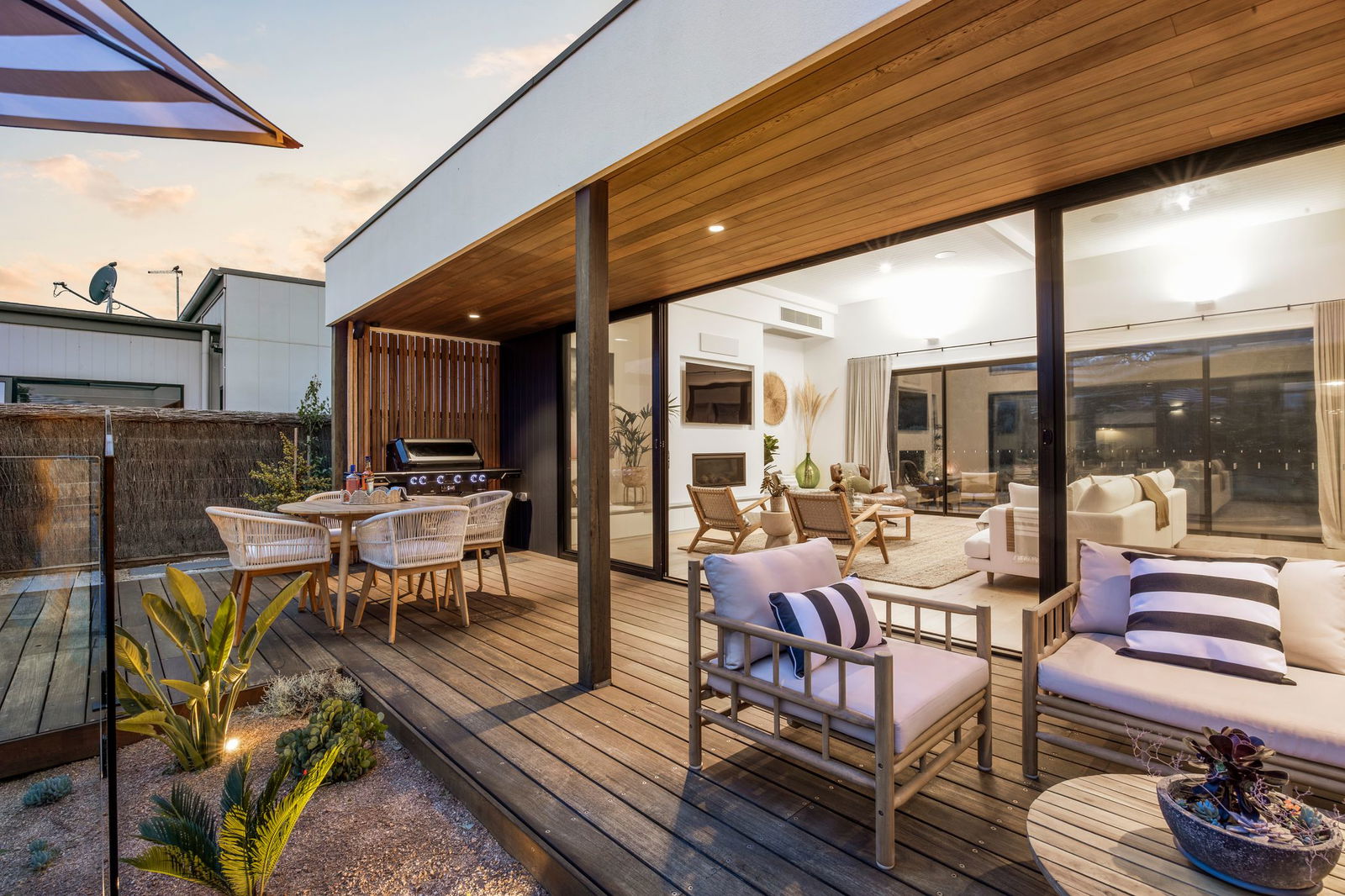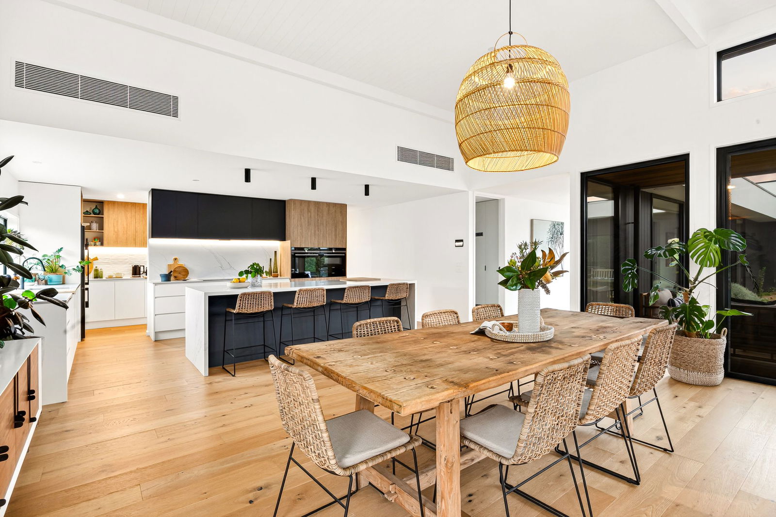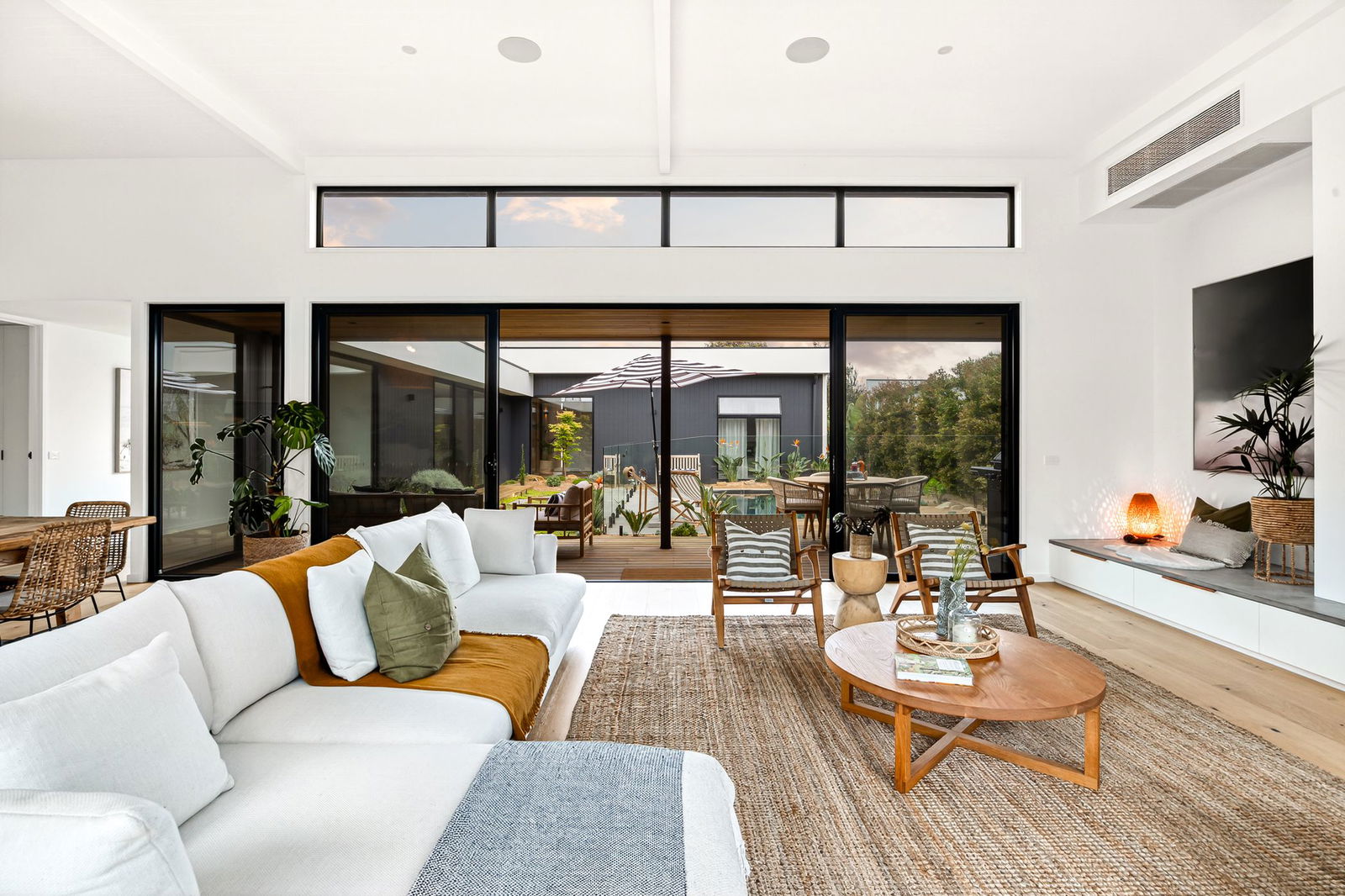 Open Plan Living/Dining: Timber floors, soaring architectural ceilings, stone-topped entertainment unit, in-built speakers, highlight windows, stacker doors to alfresco, downlights with feature dining pendant.