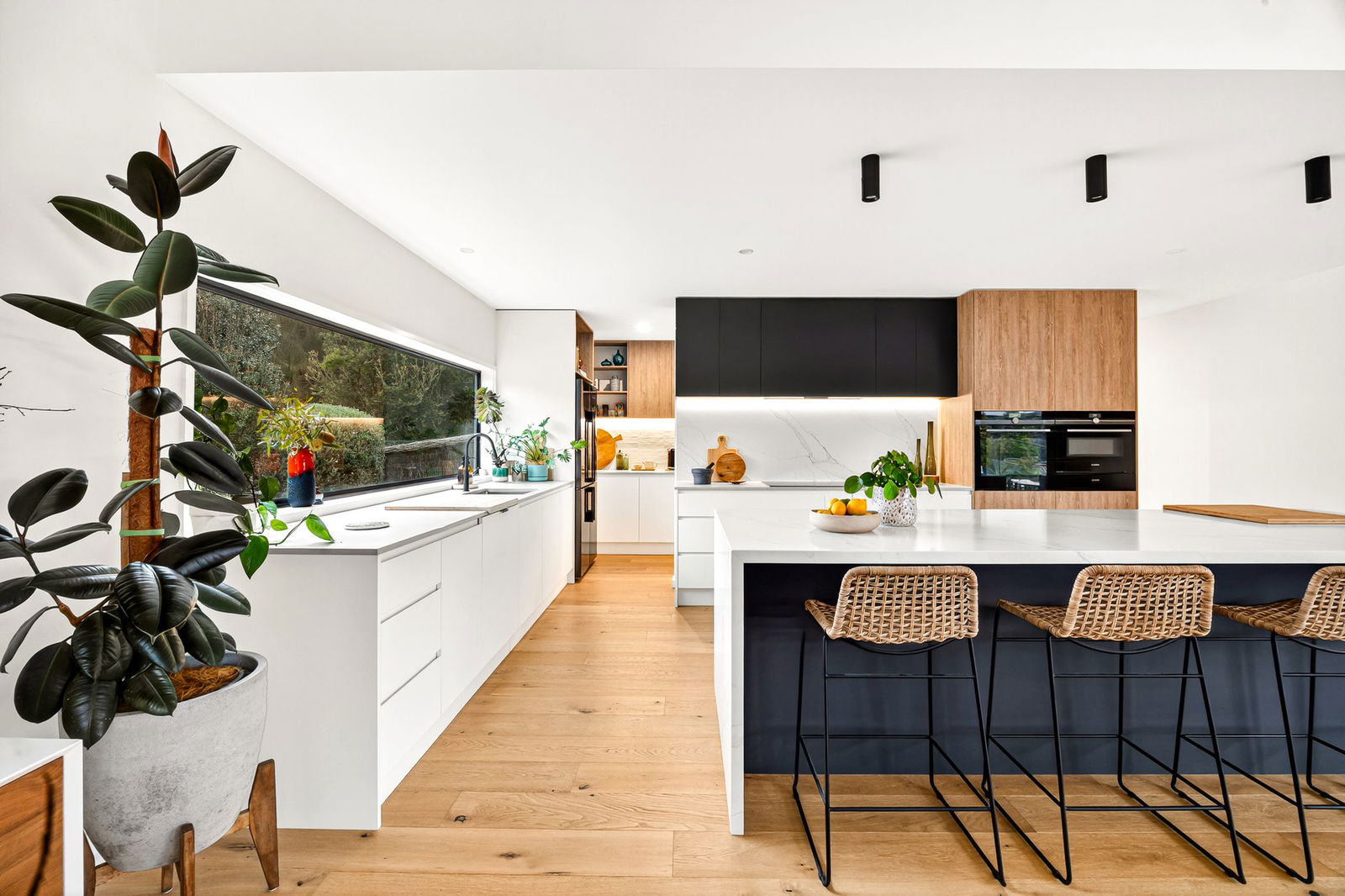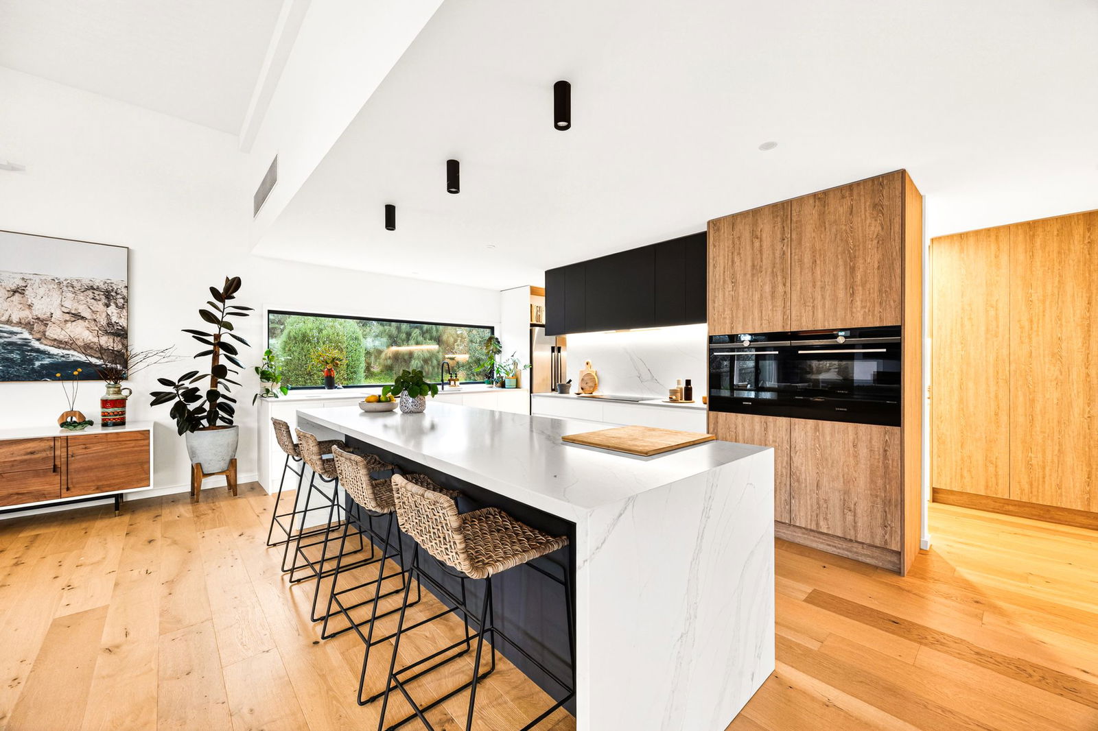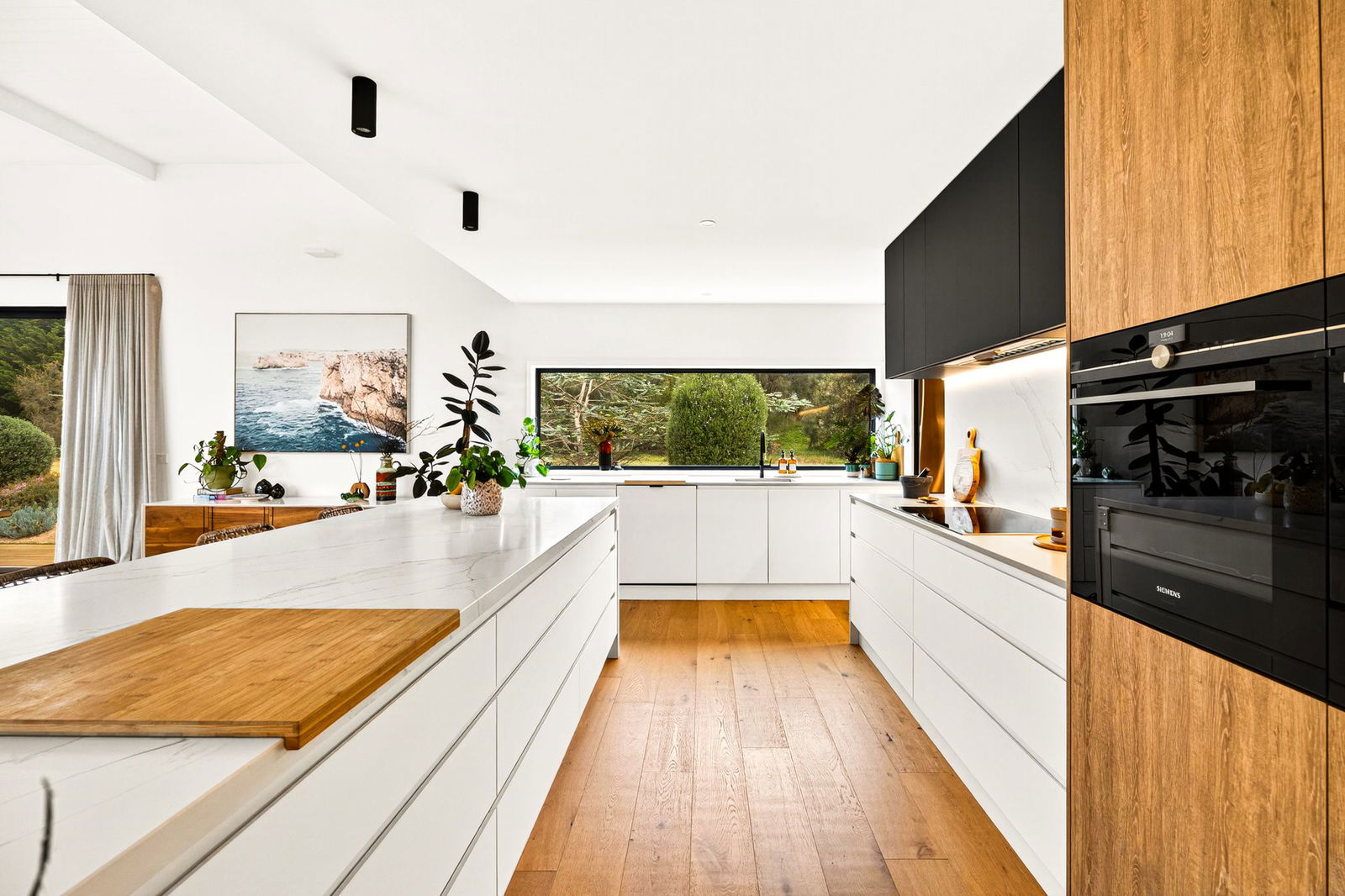 Kitchen: Large footprint with stone waterfall island bench, extensive walk-in pantry with secondary sink and fridge cavity, splashback window, twin Siemens wall ovens, cooktop with stone splashback, integrated rangehood, sensational storage options including overhead cabinetry, downlights, dishwasher, microwave cavity, and feature ceiling-mounted downlights.