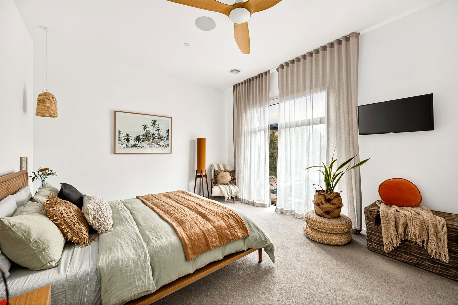 Master Suite: Elevated ceiling heights, window with roller blind and full-length sheer curtain, downlights with feature pendant, ceiling fan, in-built speakers, carpet underfoot. Extensive walk-in robe, and ensuite with floating dual vanity with underbench storage, full-height feature kit-kat tiles, feature tub with centralised window, private toilet, and shower with rail head and tiled base.