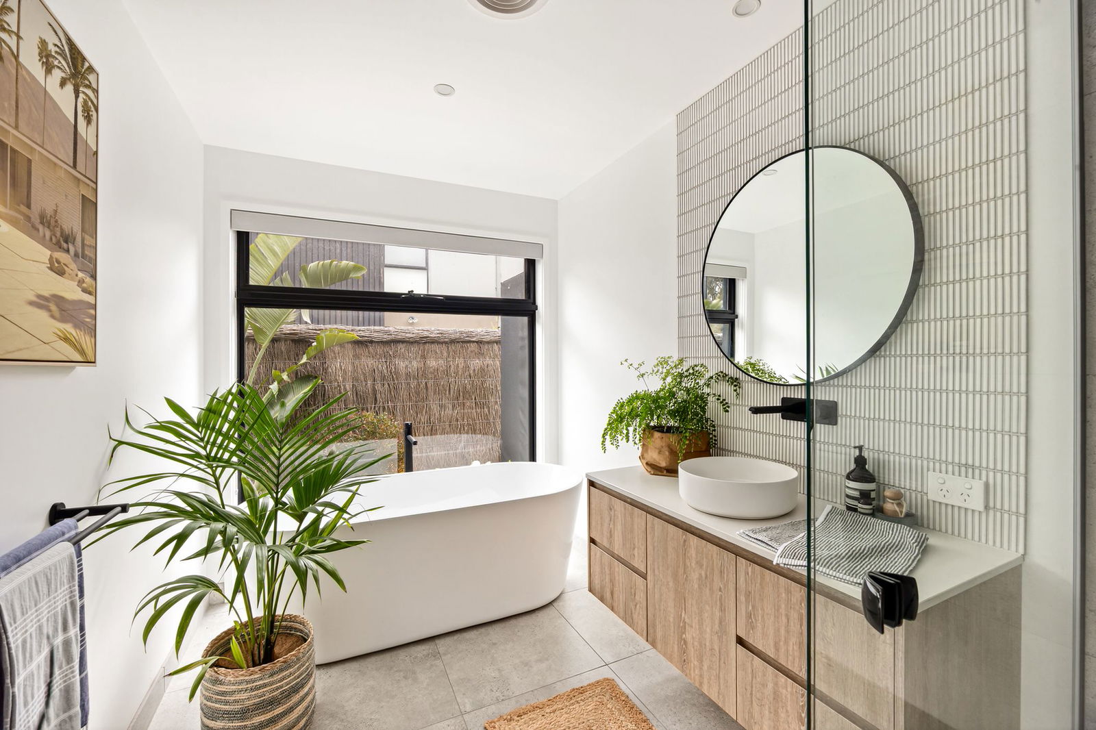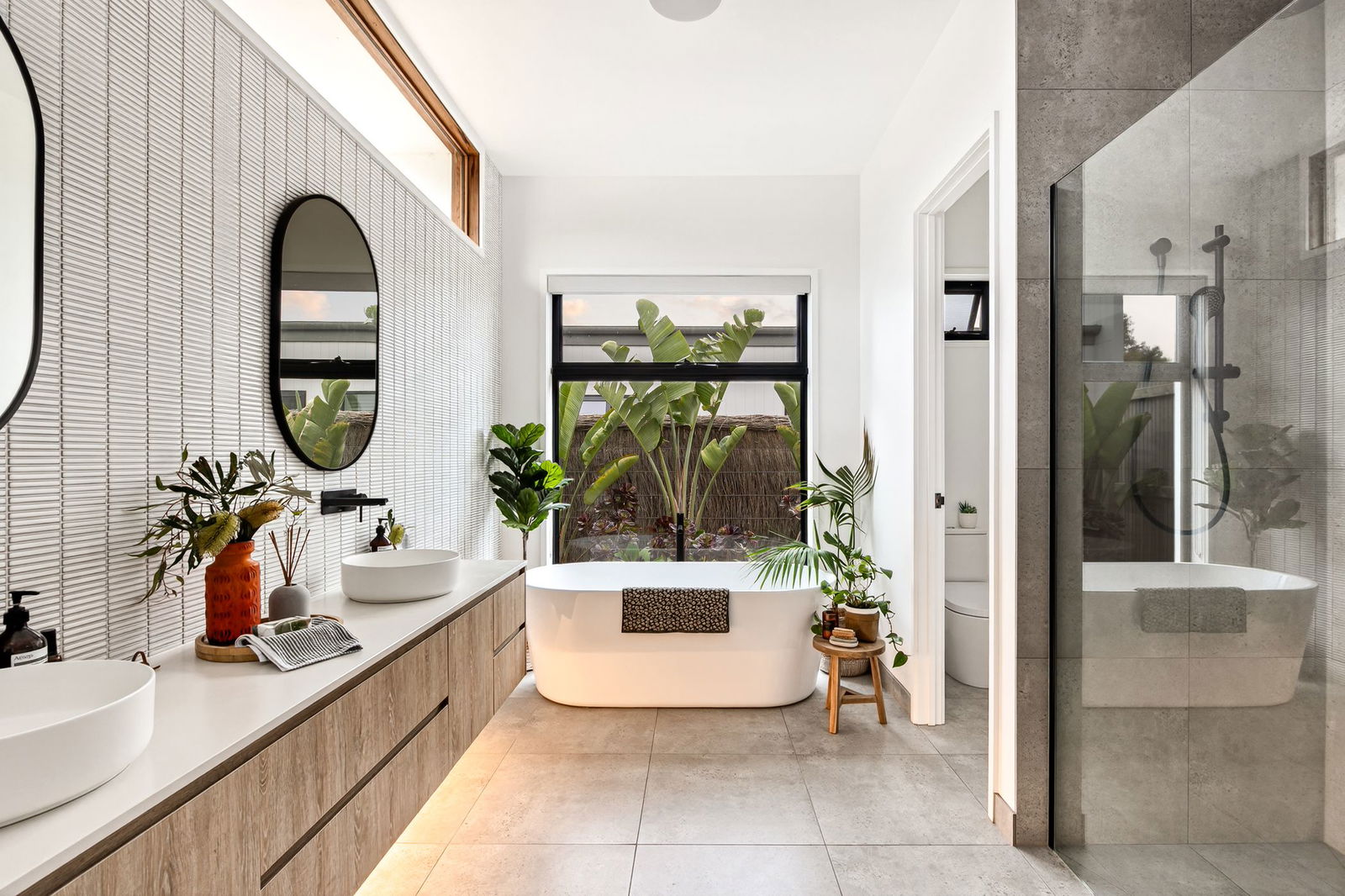 Main Bathroom: Floating single vanity with underbench storage, full-height feature kit-kat tiling, freestanding tub with centralised window, shower, and separate powder room.