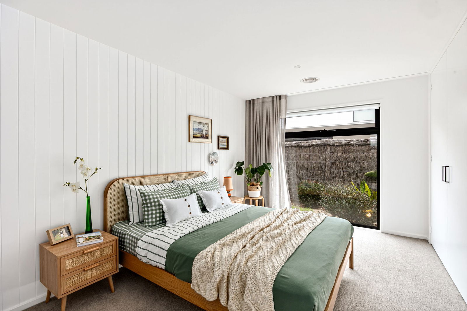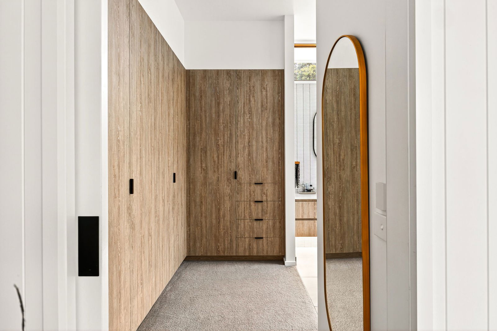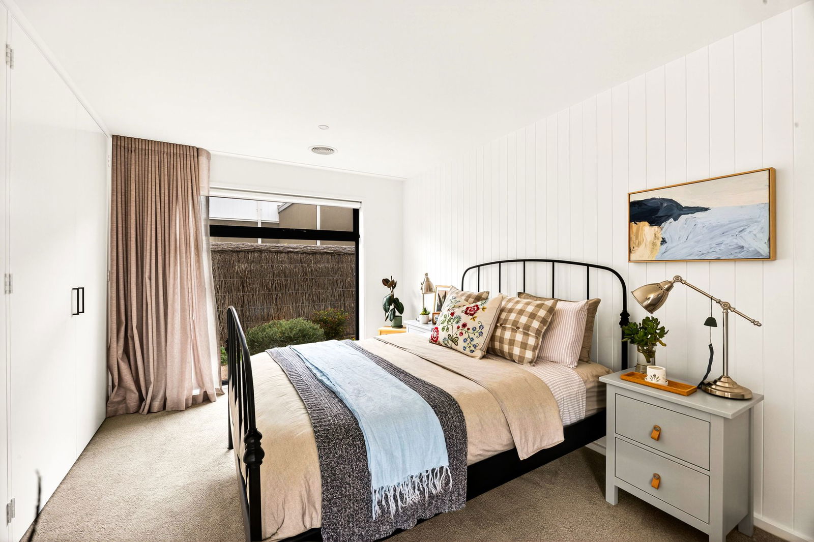 Additional Bedrooms: Two additional bedrooms with spacious proportions and extensive robing, each featuring carpet underfoot and a window with roller blind and full-height sheer curtain.