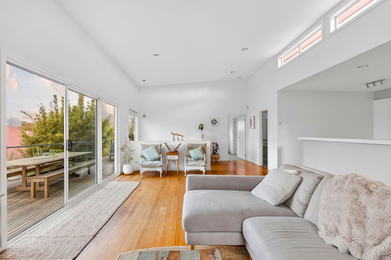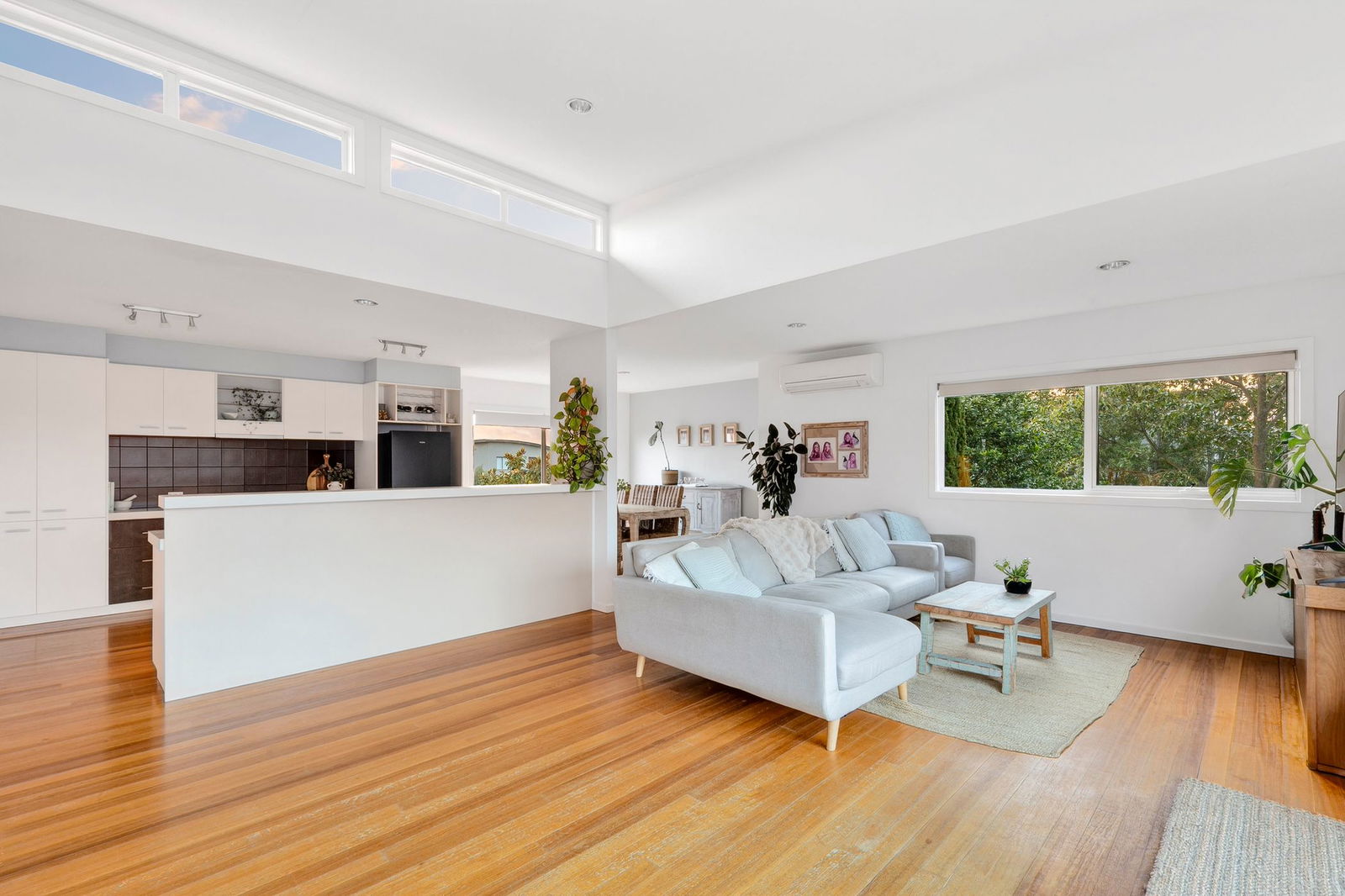 Open Plan Living/Dining: Solid timber floors, elevated ceiling height with highlighted windows in lounge zone, downlights, windows with roller blinds, split-system heating/cooling unit, and stacker doors with north-facing balcony access.