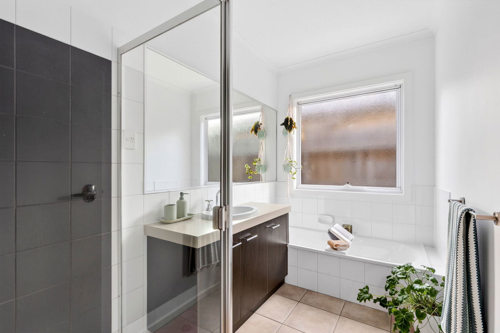 Main Bathroom: Bathtub with tiled surrounds, vanity with underbench storage, shower, window with privacy glass, and separate toilet.