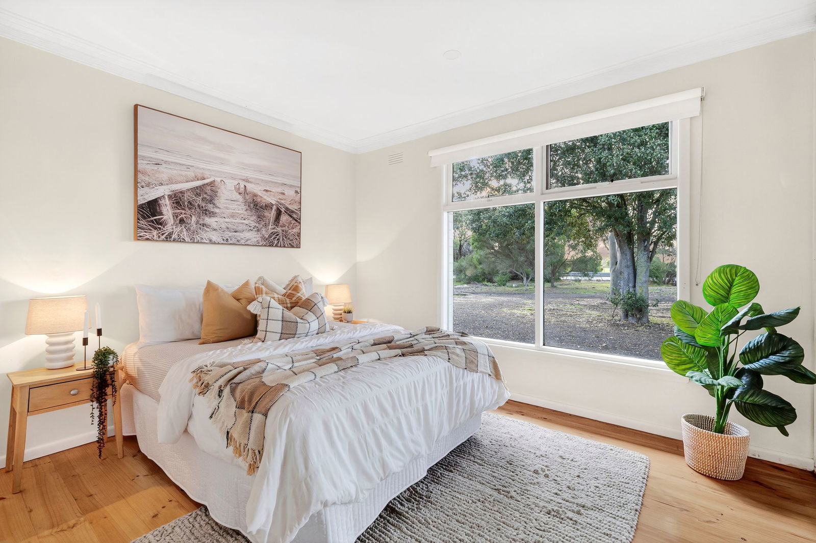 Open Plan Living/Dining: Cozy and filled with character, the main living area features timber floorboards, abundant windows, and a cosy fireplace for winter comfort. Split system air conditioning ensures year-round climate control, while the open layout invites relaxed gatherings with family and friends.