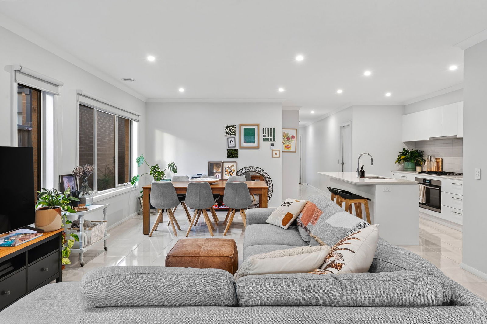 Open Plan Living/Dining: Tiled floors, downlights, windows with roller blinds, and sliding door access to the rear alfresco.