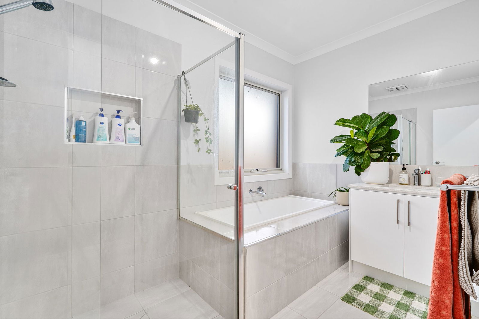 Main Bathroom: Oversized shower with niche and tiled base, separate tub, single vanity with underbench storage and stone top, and separate toilet.