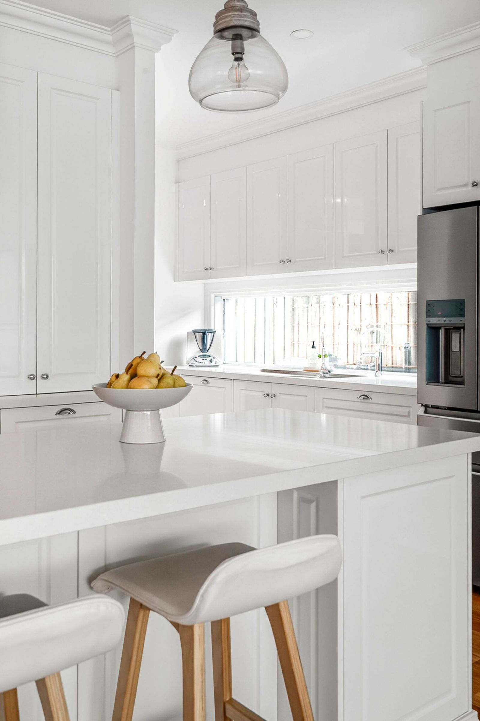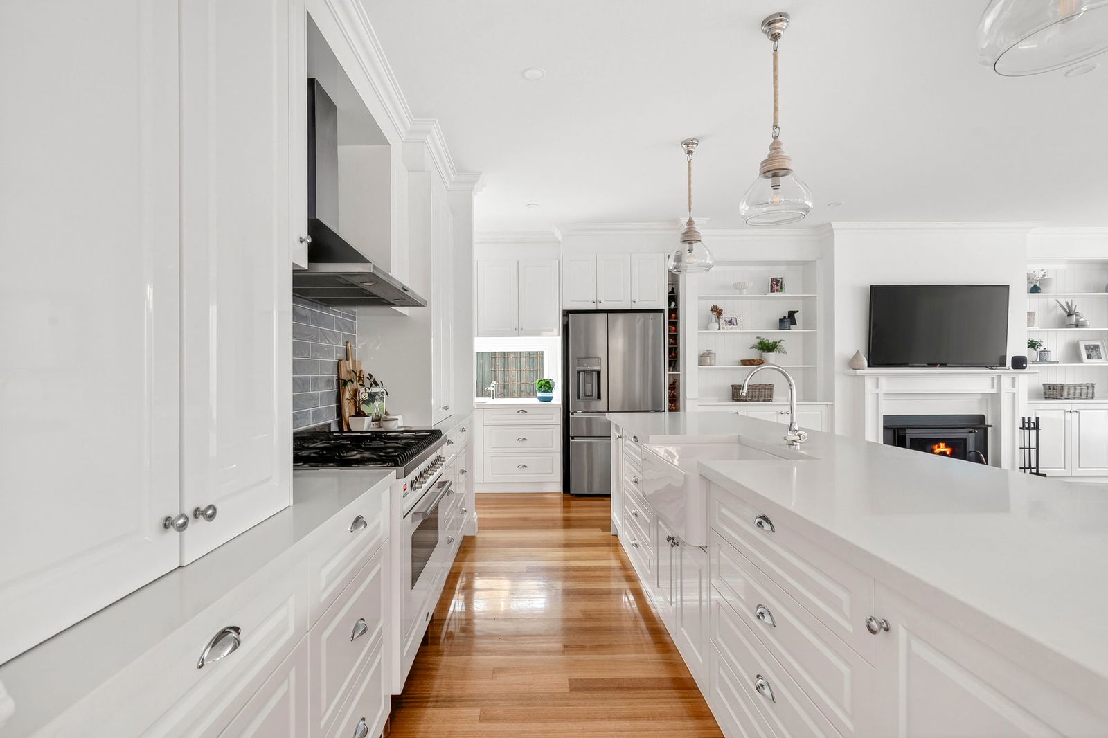 Kitchen – Stunning entertainers kitchen featuring stone benchtops, 900mm Ilve freestanding oven with gas cooktop, apron front butlers sink, glass pendant lighting overhead capacious island bench, fully appointed walk-in pantry with floor to ceiling shelves, 2nd sink & ample bench space, crisp white shaker style cabinetry, textured subway tiled splashback & hardwood timber flooring