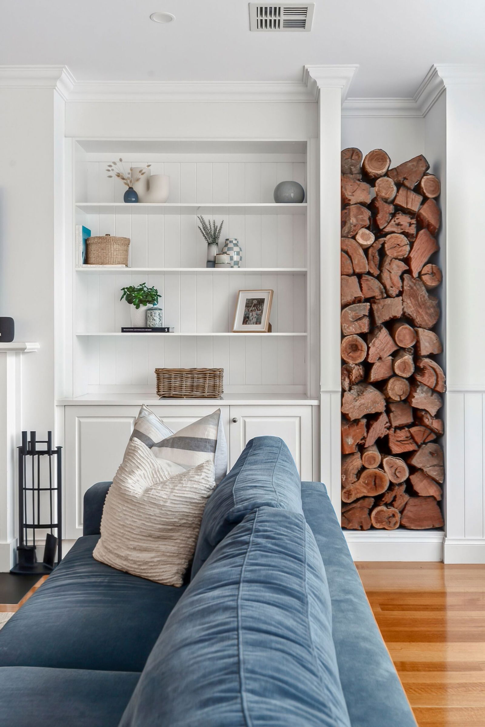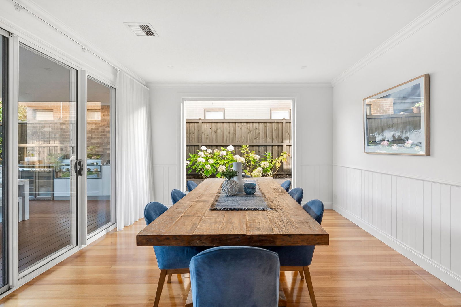 Living/Dining – Brightly lit, north facing open plan living & dining area with immediate connection to the outdoor alfresco area, hardwood timber floors, wood fire, bespoke joinery & shelving, downlights, sheer curtains, VJ wall panelling, feature picture window to the dining, zoned refrigerated heating & cooling