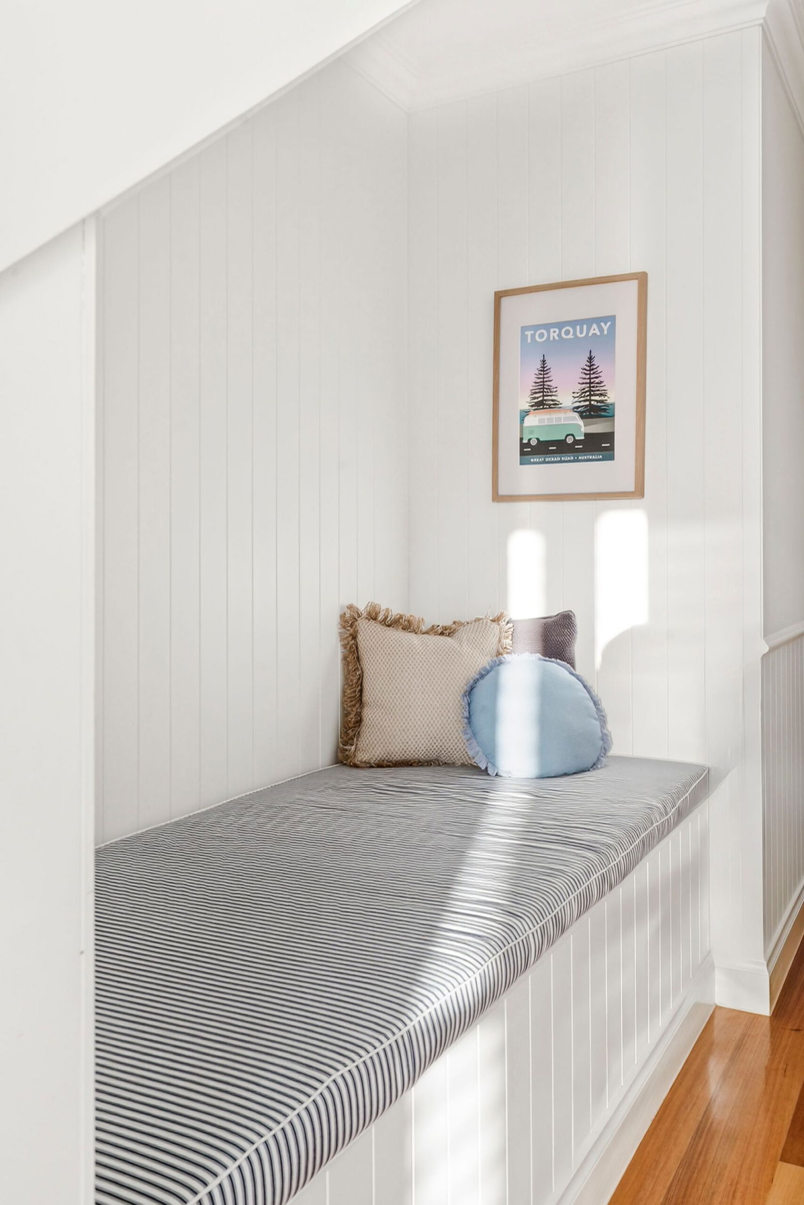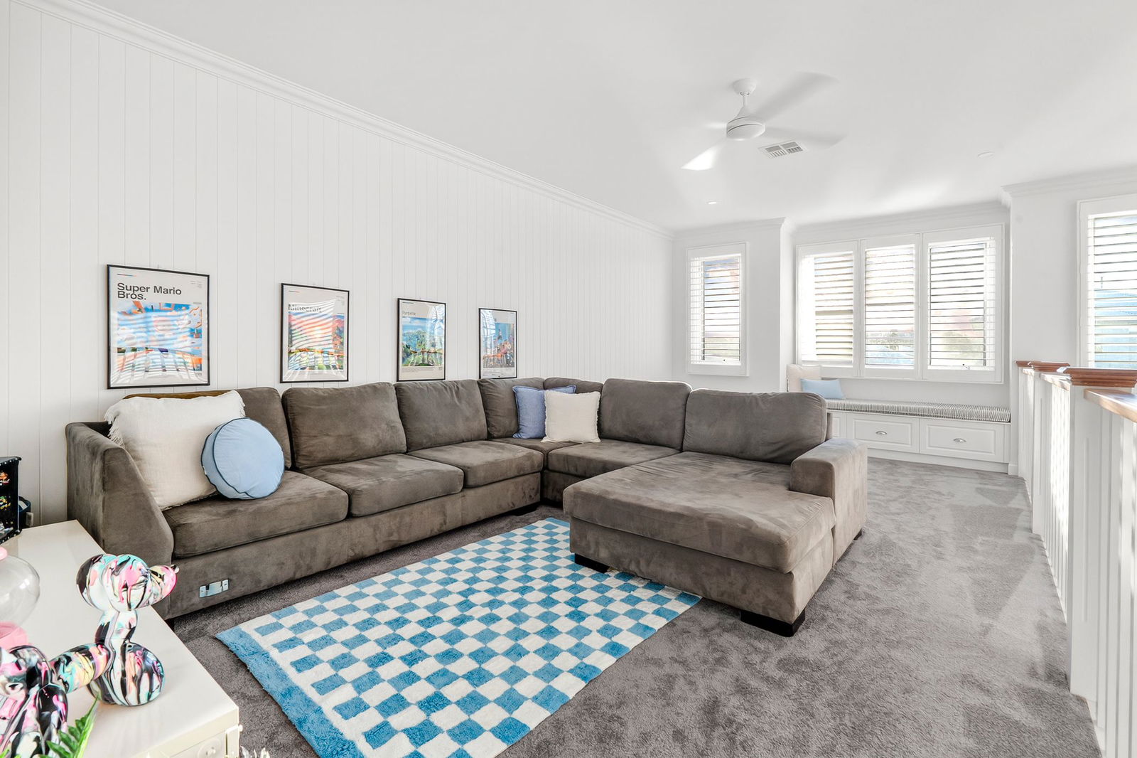 Rumpus Room – Upper level rumpus room with plush carpets underfoot, VJ wall panelling, ceiling fan, plantation shutters & built-in banquette seat with storage