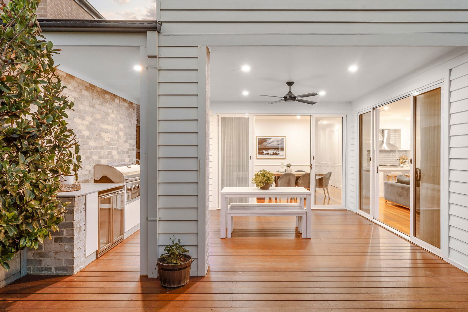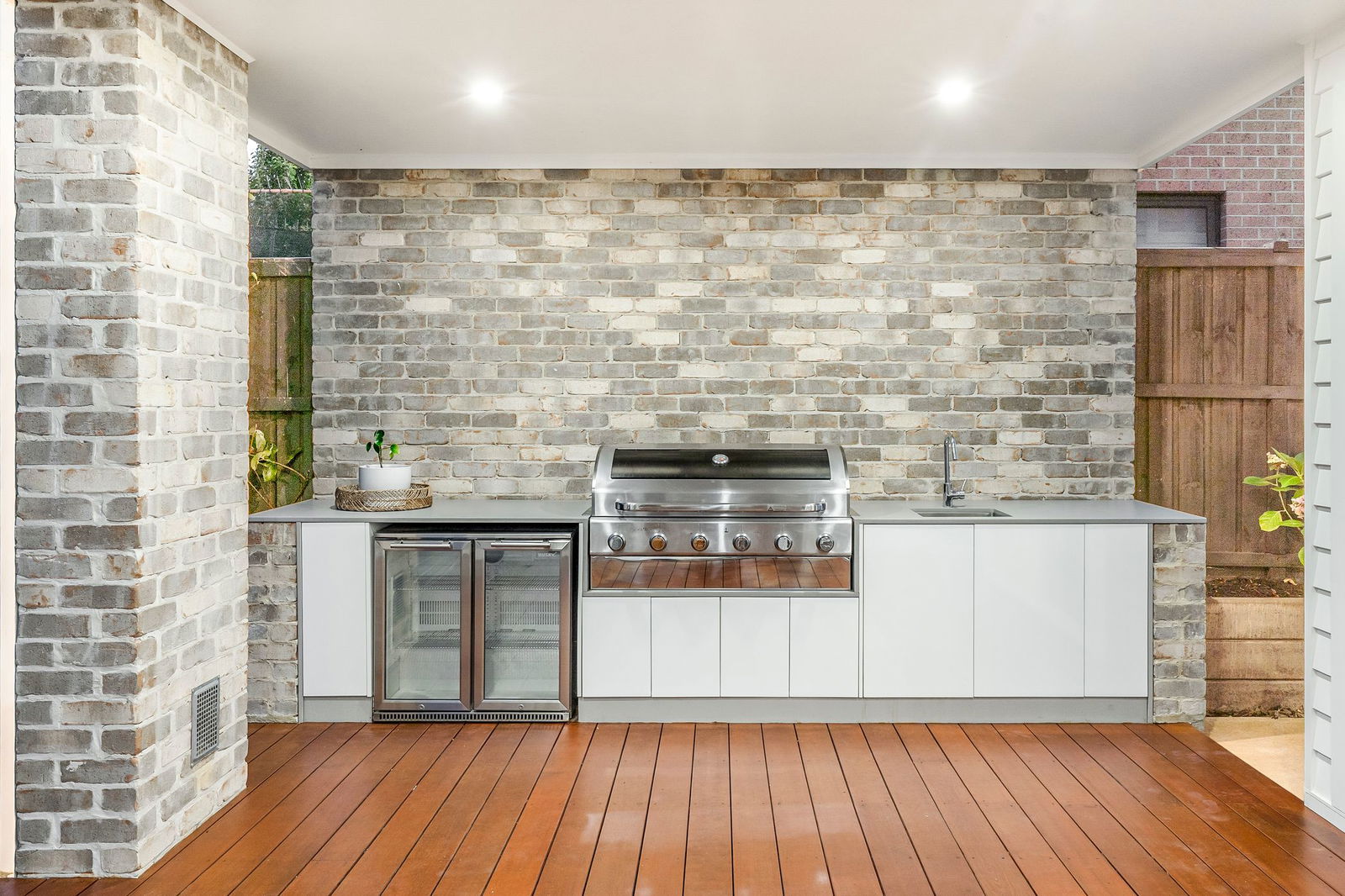 Outdoors – James Hardie Linea Weatherboard cladding, concrete retaining walls in back yard, executive alfresco deck, undercover with ceiling fan & downlights, exposed brick feature wall, built-in Husky fridge, sink, custom joinery & natural gas connected bbq, lush lawns bordered by established trees, side gate entry & rear roller entry to the double lock up garage, 448 sqm allotment (approx)