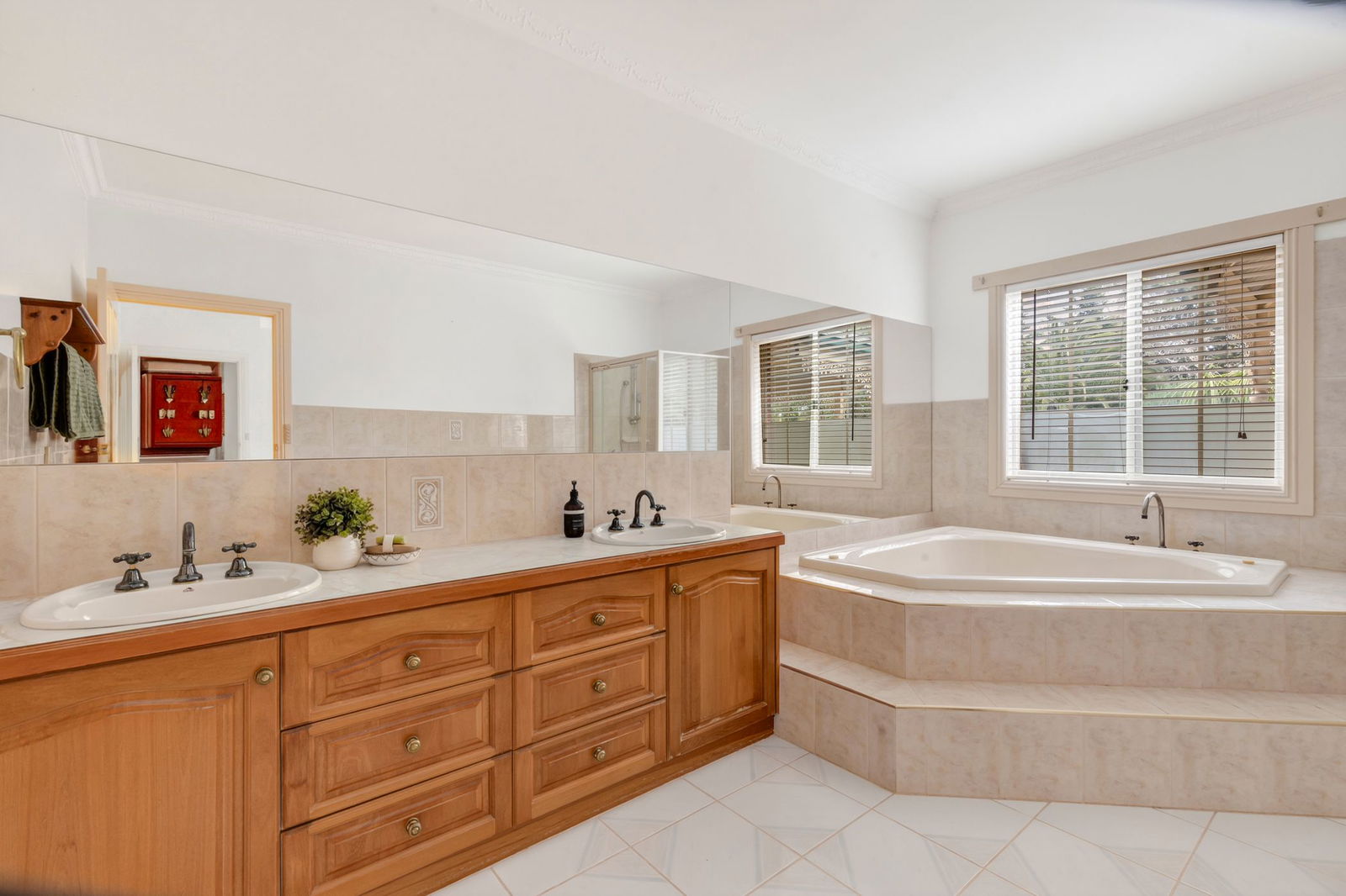 Main Bathroom: In-built tub with tiled surrounding, window with roller blind, timber vanity with twin basins and underbench storage, large wall mirror, shower with rail head, and separate toilet.